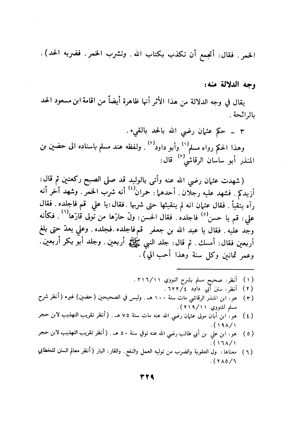 (شهدت عثمان رضي الله عنه وأتى بالوليد قد صلى الصبح ركعتين ثم قال: أزيدكم. فشهد عليه رجلان. أحدهما: حمران (4) أنه شرب الخمر. وشهد آخر أنه رآه يتقيأ. فقال عثمان إنه لم يتقيئها حتى شربها. فقال: يا علي قم فاجلده. فقال علي: قم يا حسن (5) فاجلده. فقال الحسن: ولّ حارّها من تولى قارّها (6) . فكأنه