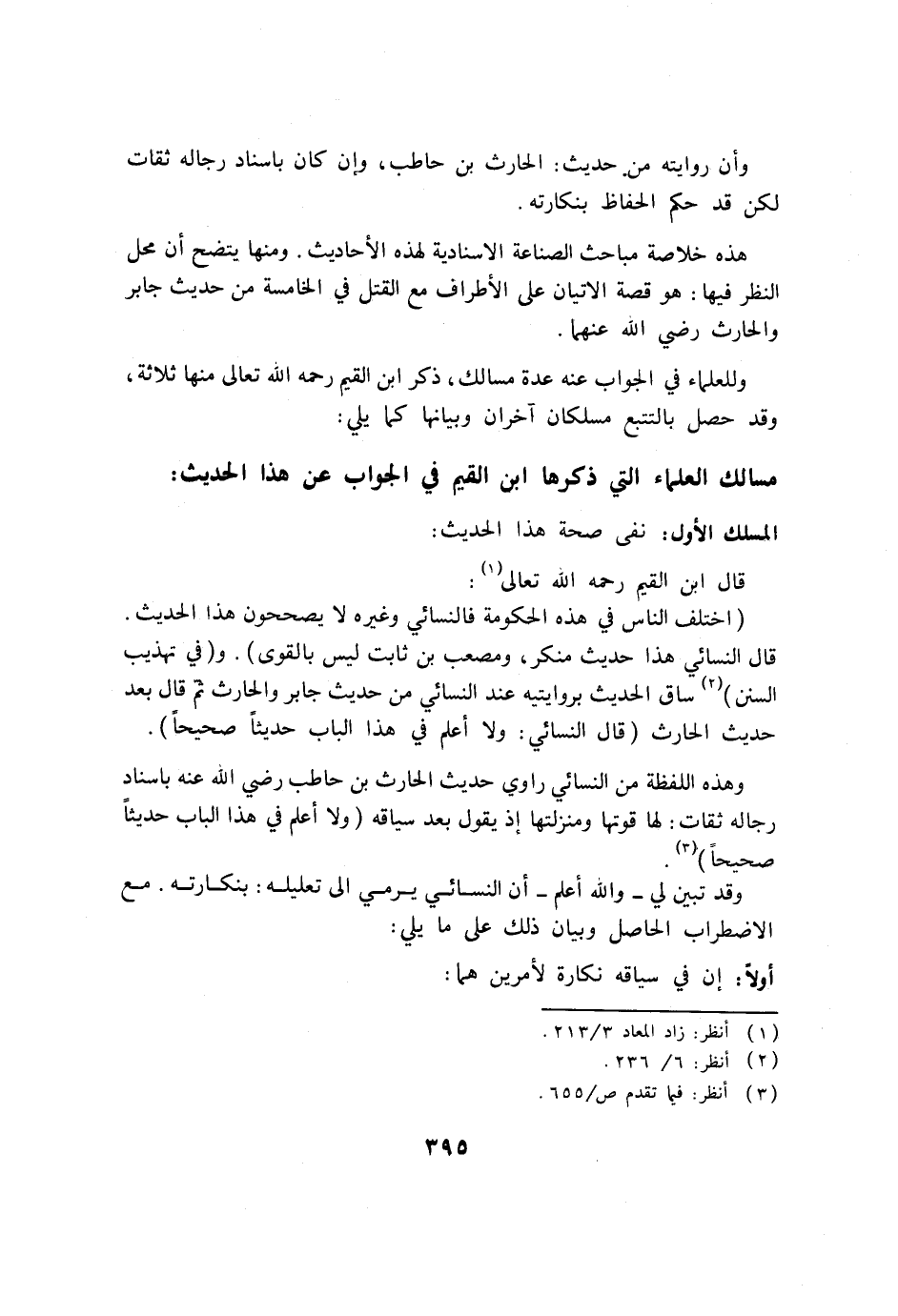 قال النسائي هذا حديث منكر، ومصعب بن ثابت ليس بالقوى) . و (في تهذيب السنن) (2) ساق الحديث بروايتيه عند النسائي من حديث جابر والحارث ثم قال بعد حديث الحارث (قال النسائي: ولا أعلم في هذا الباب حديثاً صحيحاً) . وهذه اللفظة من النسائي راوي حديث الحارث بن حاطب رضي الله عنه بإسناد رجاله ثقات: لها قوتها ومنزلتها إذ يقول بعد سياقه (ولا أعلم في هذا الباب حديثاً صحيحاً) (3) .