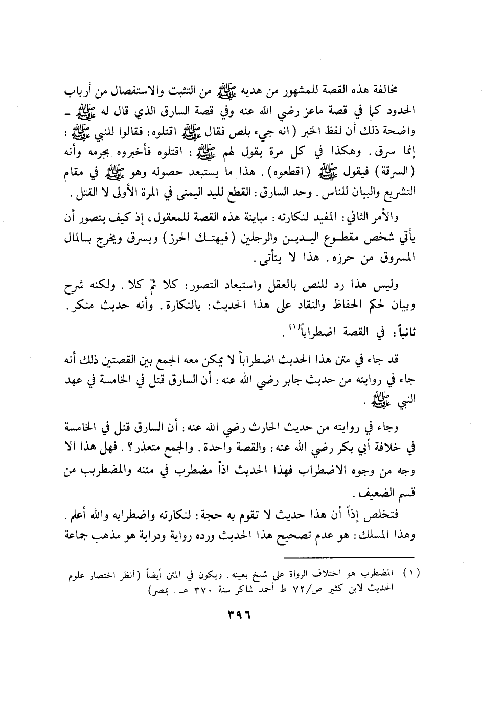 مخالفة هذه القصة للمشهور من هديه صلى الله عليه وسلم من التثبت والاستفصال من أرباب الحدود كما في قصة ماعز رضي الله عنه وفي قصة السارق الذي قال له صلى الله عليه وسلم - واضحة ذلك أن لفظ الخبر (أنه جيء بلص فقال صلى الله عليه وسلم اقتلوه: فقالوا للنبي صلى الله عليه وسلم: إنما سرق. وهكذا في كل مرة يقول لهم صلى الله عليه وسلم: اقتلوه فأخبروه بجرمه وأنه (السرقة) فيقول صلى الله عليه وسلم (اقطعوه) . هذا ما يستبعد حصوله وهو صلى الله عليه وسلم في مقام التشريع والبيان للناس. وحد السارق: القطع لليد اليمنى في المرة الأولى لا القتل. والأمر الثاني: المفيد لنكارته: مباينة هذه القصة للمعقول، إذ كيف يتصور أن يأتي شخص مقطوع اليدين والرجلين (فيهتك الحرز) ويسرق ويخرج بالمال المسروق من حرزه. هذا لا يتأتى.