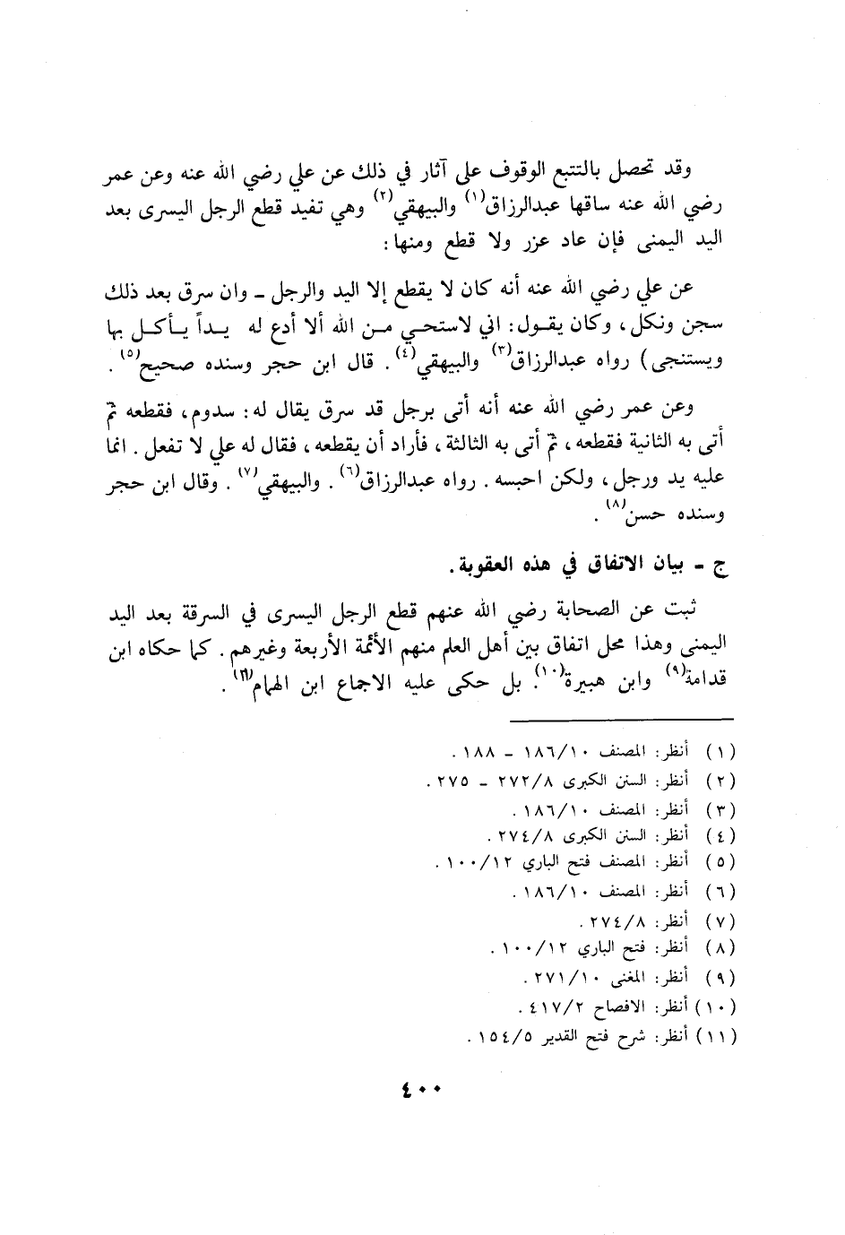 وقد تحصل بالتتبع الوقوف على آثار في ذلك عن علي رضي الله عنه وعن عمر رضي الله عنه ساقها عبد الرزاق (1) والبيهقي (2) وهي تفيد قطع الرجل اليسرى بعد اليد اليمنى فإن عاد عزر ولا قطع ومنها: