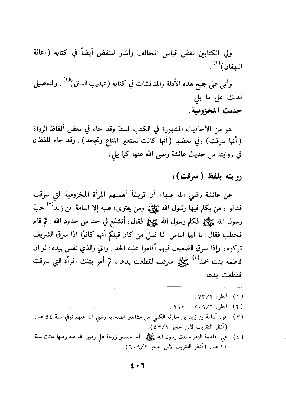 عن عائشة رضي الله عنها: أن قريشاً أهمتهم المرأة المخزومية التي سرقت فقالوا: من يكلم فيها رسول الله صلى الله عليه وسلم ومن يجترئ عليه إلا أسامة بن زيد (3) حبّ رسول الله صلى الله عليه وسلم فكلم رسول الله صلى الله عليه وسلم فقال: أتشفع في حد من حدود الله. ثم قام فخطب فقال: يا أيها الناس إنما ضلّ من كان قبلكم أنهم كانوا إذا سرق الشريف تركوه، وإذا سرق الضعيف فيهم أقاموا عليه الحد. وإني والذي نفسي بيده: لو أن فاطمة بنت محمد (4) صلى الله عليه وسلم سرقت لقطعت يدها، ثم أمر بتلك المرأة التي سرقت فقطعت يدها.