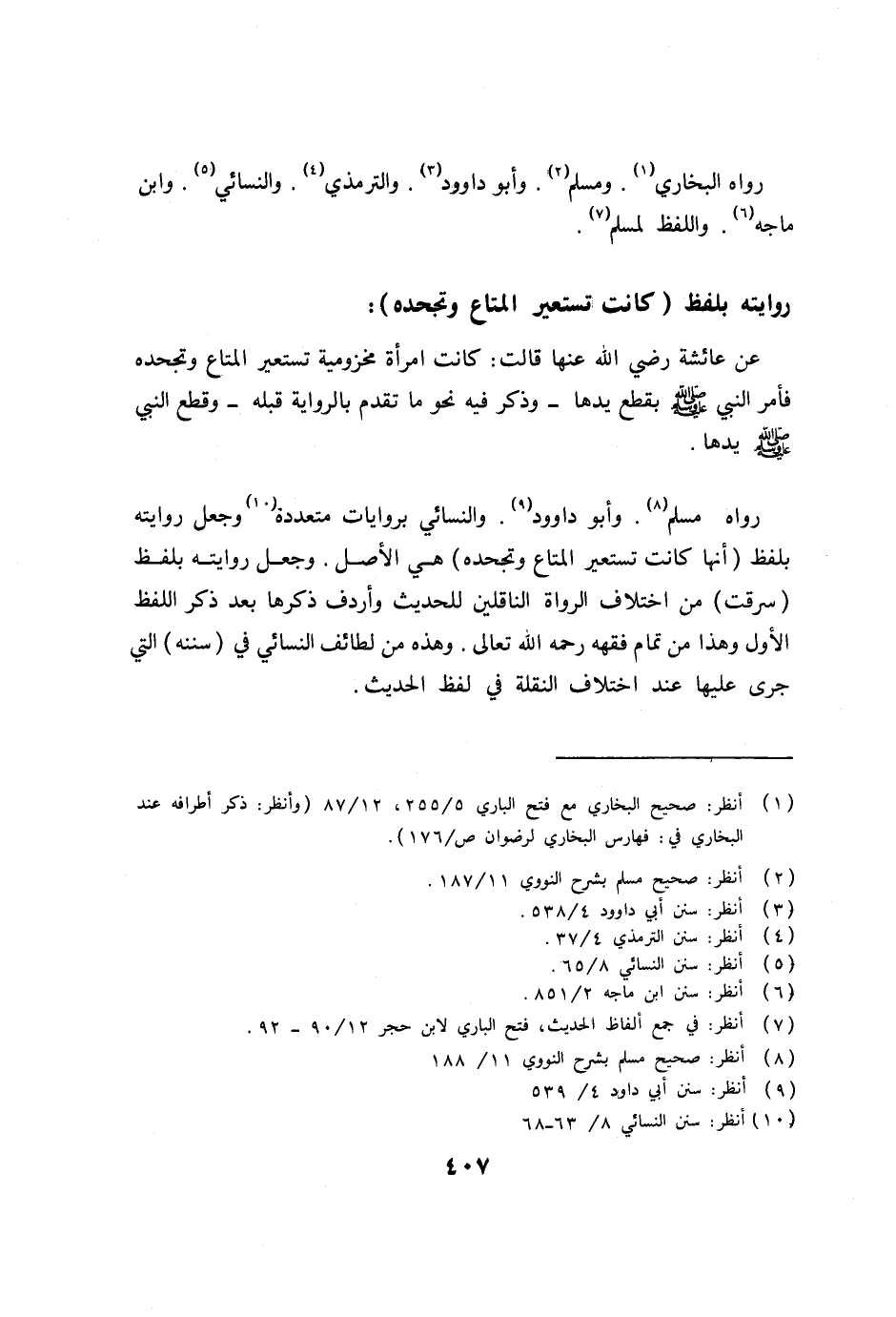 رواه مسلم (8) . وأبو داوود (9) . والنسائي بروايات متعددة (10) وجعل روايته بلفظ (أنها كانت تستعير المتاع وتجحده) هي الأصل. وجعل روايته بلفظ (سرقت) من اختلاف الرواة الناقلين للحديث وأردف ذكرها بعد ذكر اللفظ الأول وهذا من تمام فقهه رحمه الله تعالى. وهذه من لطائف النسائي في (سننه) التي جرى عليها عند اختلاف النقلة في لفظ الحديث.