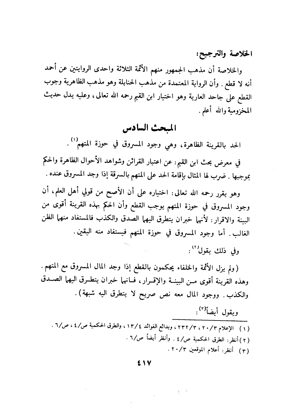 في معرض بحث ابن القيم: عن اعتبار القرائن وشواهد الأحوال الظاهرة والحكم بموجبها. ضرب لها المثال بإقامة الحد على المتهم بالسرقة إذا وجد المسروق عنده. وهو يقرر رحمه الله تعالى: اختياره على أن الأصح من قولي أهل العلم، أن وجود المسروق في حوزة المتهم يوجب القطع وإن الحكم بهذه القرينة أقوى من البينة والإقرار: لأنها خبران يتطرق إليهما الصدق والكذب فالمستفاد منهما الظن الغالب. أما وجود المسروق في حوزة المتهم فيستفاد منه اليقين.
