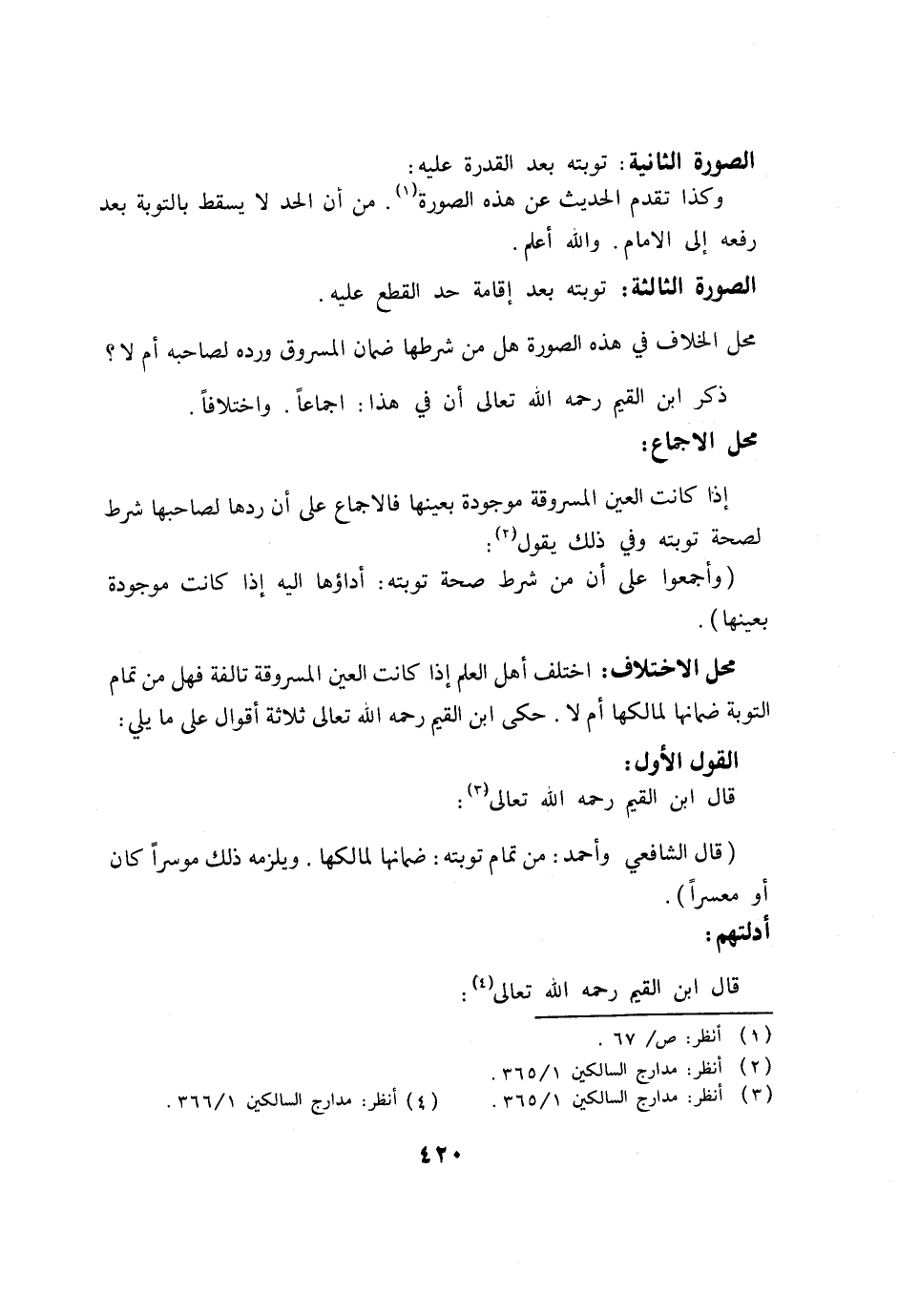 محل الاختلاف: اختلف أهل العلم إذا كانت العين المسروقة تالفة فهل من تمام التوبة ضمانها لمالكها أم لا. حكى ابن القيم رحمه الله تعالى ثلاثة أقوال على ما يلي: