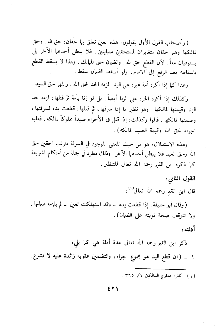 (وأصحاب القول الأول يقولون: هذه العين تعلق بها حقان: حق لله. وحق لمالكها وهما حقان متغايران لمستحقين متباينين. فلا يبطل أحدهما الآخر بل يستوفيان معاً. لأن القطع حق لله. والضمان حق للمالك. ولهذا لا يسقط القطع بإسقاطه بعد الرفع إلى الإمام. ولو أسقط الضمان سقط.