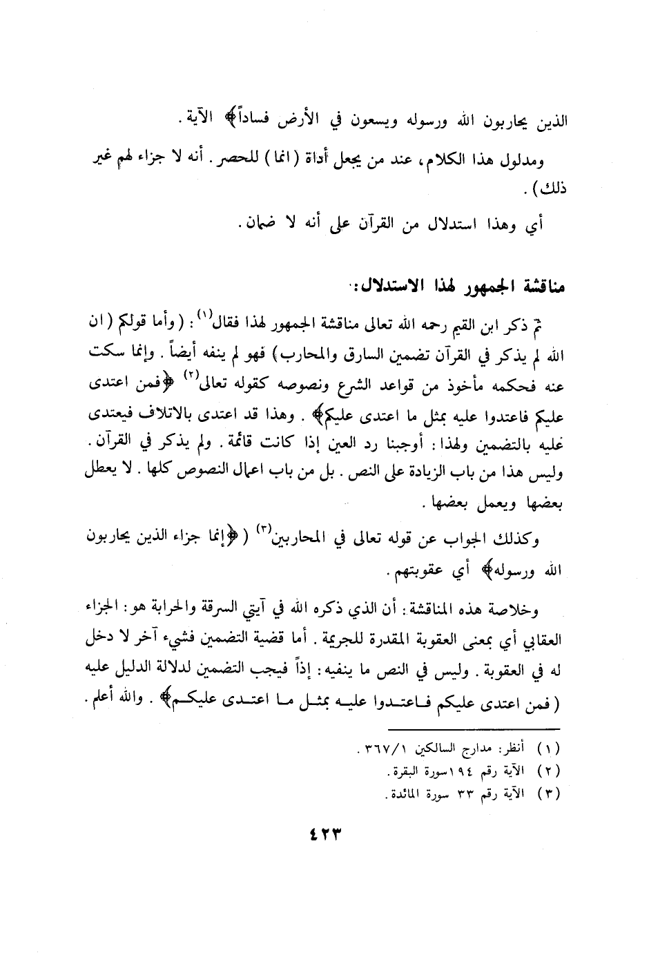 وخلاصة هذه المناقشة: أن الذي ذكره الله في آيتي السرقة والحرابة هو: الجزاء العقابي أي بمعنى العقوبة المقدرة للجريمة. أما قضية التضمين فشيء آخر لا دخل له في العقوبة. وليس في النص ما ينفيه: إذا فيجب التضمين لدلالة الدليل عليه (فمن اعتدى عليكم فاعتدوا عليه بمثل ما اعتدى عليكم) . والله أعلم.
