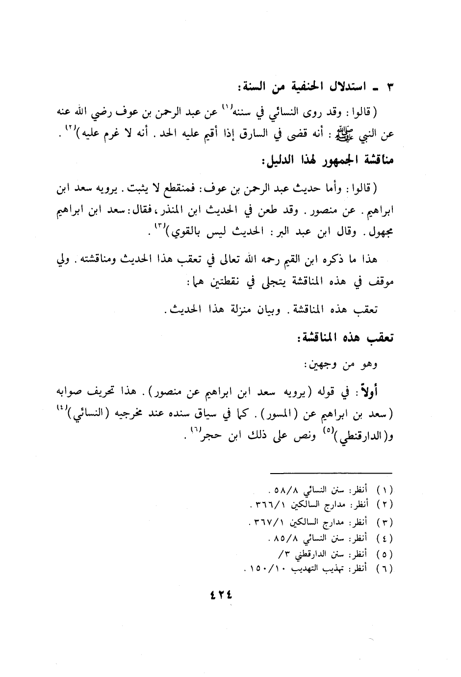 (قالوا: وأما حديث عبد الرحمن بن عوف: فمنقطع لا يثبت. يرويه سعد ابن إبراهيم. عن منصور. وقد طعن في الحديث ابن المنذر، فقال: سعد ابن إبراهيم مجهول. وقال ابن عبد البر: الحديث ليس بالقوي) (3) .