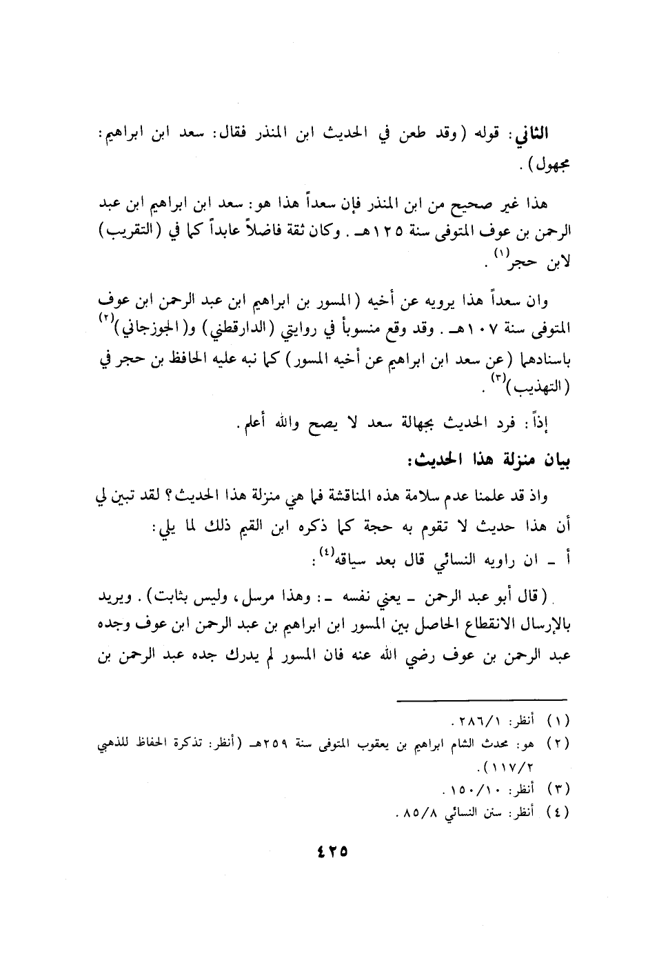 . (قال أبو عبد الرحمن- يعني نفسه -: وهذا مرسل، وليس بثابت) . ويريد بالإرسال الانقطاع الحاصل بين المسور ابن إبراهيم بن عبد الرحمن ابن عوف وجده عبد الرحمن بن عوف رضي الله عنه فإن المسور لم يدرك جده عبد الرحمن بن