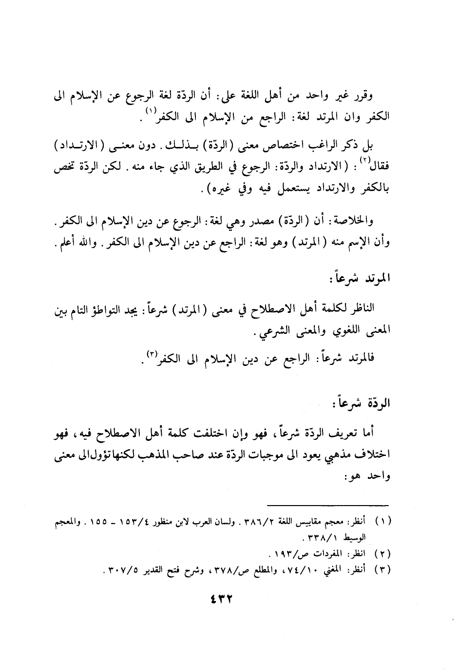 وقرر غير واحد من أهل اللغة على: أن الردّة لغة الرجوع عن الإسلام إلى الكفر وأن المرتد لغة: الراجع من الإسلام إلى الكفر (1) .