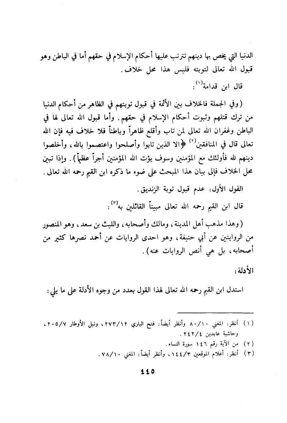 من ترك قتلهم وثبوت أحكام الإسلام في حقهم. وأما قبول الله تعالى لها في الباطن وغفران الله تعالى لمن تاب وأقلع ظاهراً وباطنا فلا خلاف فيه فإن الله تعالى قال في المنافقين (2) (إلا الذين تابوا وأصلحوا واعتصموا بالله، وأخلصوا دينهم لله فأولئك مع المؤمنين وسوف يؤت الله المؤمنين أجراً عظما) . وإذا تبين محل الخلاف فإلى بيان هذا المبحث على ضوء ما ذكره ابن القيم رحمه الله تعالى.