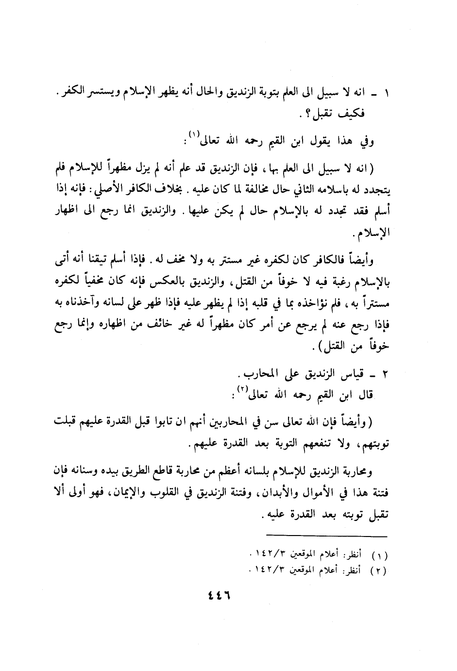 ومحاربة الزنديق للإسلام بلسانه أعظم من محاربة قاطع الطريق بيده وسنانه فإن فتنة هذا في الأموال والأبدان، وفتنة الزنديق في القلوب والإيمان، فهو أولى ألا تقبل توبته بعد القدرة عليه.