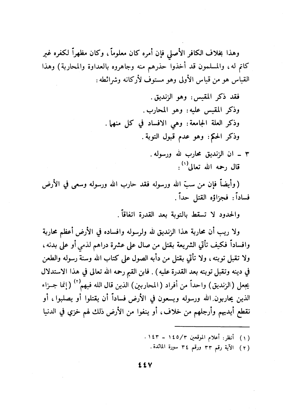 ولا ريب أن محاربة هذا الزنديق لله ولرسوله وإفساده في الأرض أعظم محاربة وإفساداً فكيف تأتي الشريعة بقتل من صال على عشرة دراهم لذمي أو على بدنه، ولا تقبل توبته، ولا تأتي بقتل من دأبه الصول على كتاب الله وسنة رسوله والطعن في دينه وتقبل توبته بعد القدرة عليه) . فابن القيم رحمه الله تعالى في هذا الاستدلال يجعل (الزنديق) واحداً من أفراد (المحاربين) الذين قال الله فيهم (2) (إنما جزاء الذين يحاربون الله ورسوله ويسعون في الأرض فساداً أن يقتلوا أو يصلبوا، أو تقطع أيديهم وأرجلهم من خلاف، أو ينفوا من الأرض ذلك لهم خزي في الدنيا