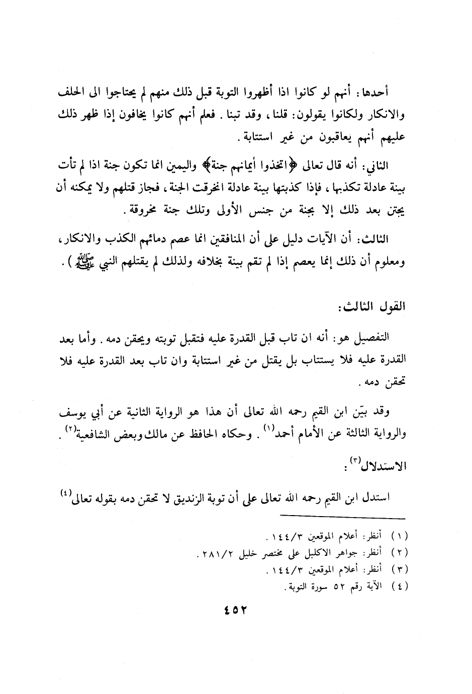 استدل ابن القيم رحمه الله تعالى على أن توبة الزنديق لا تحقن دمه بقوله تعالى (4)