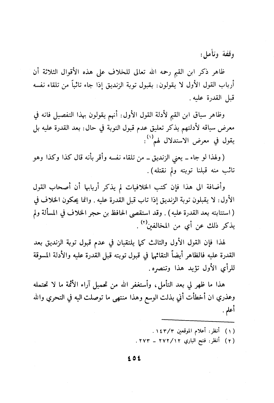 وإضافة إلى هذا فإن كتب الخلافيات لم يذكر أربابها أن أصحاب القول الأول: لا يقبلون توبة الزنديق إذا تاب قبل القدرة عليه. وإنما يحكون الخلاف في (استتابته بعد القدرة عليه) . وقد استقصى الحافظ بن حجر الخلاف في المسألة ولم يذكر ذلك عن أي من المخالفين (2) .