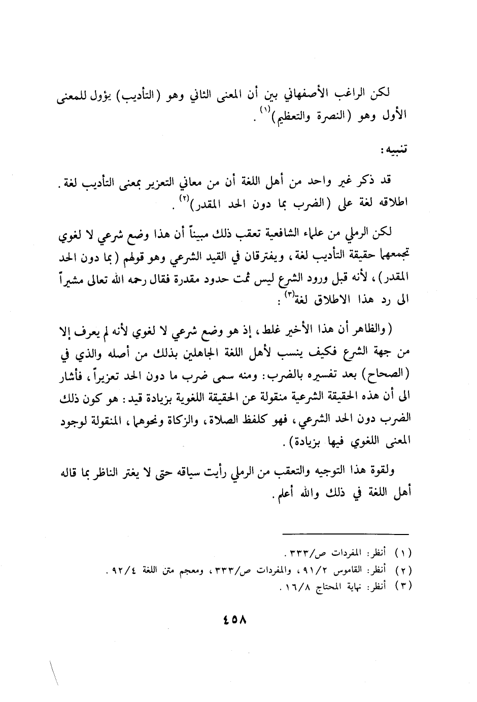 من جهة الشرع فكيف ينسب لأهل اللغة الجاهلين بذلك من أصله والذي في (الصحاح) بعد تفسيره بالضرب: ومنه سمى ضرب ما دون الحد تعزيراً، فأشار إلى أن هذه الحقيقة الشرعية منقولة عن الحقيقة اللغوية بزيادة قيد: هو كون ذلك الضرب دون الحد الشرعي، فهو كلفظ الصلاة، والزكاة ونحوهما، المنقولة لوجود المعنى اللغوي فيها. بزيادة) .