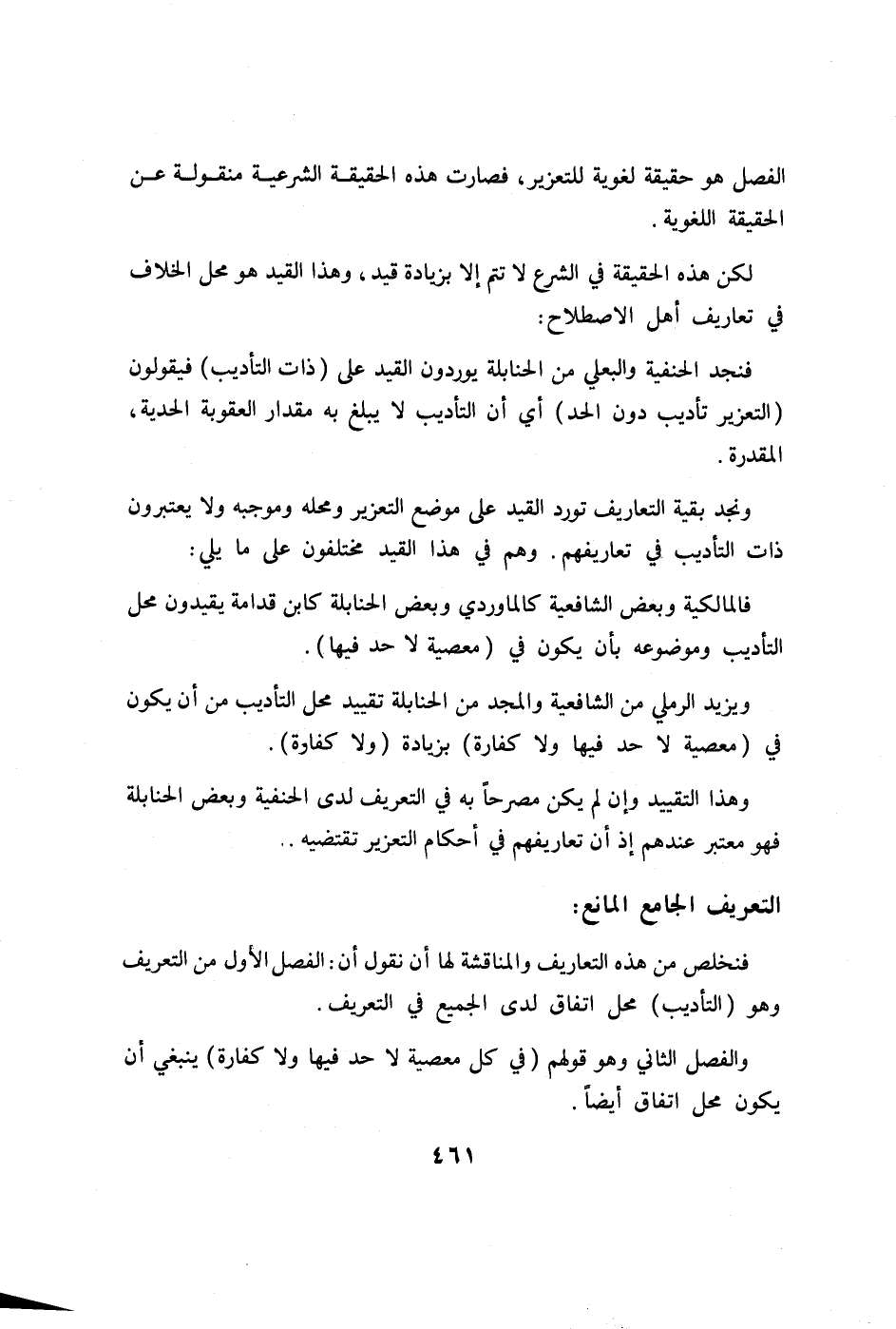 وهذا التقييد وإن لم يكن مصرحاً به في التعريف لدى الحنفية وبعض الحنابلة فهو معتبر عندهم إذ أن تعاريفهم في أحكام التعزير تقتضيه..