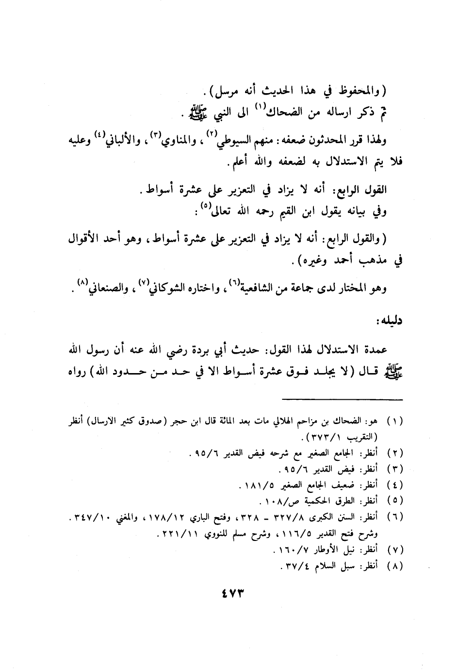 (والقول الرابع: أنه لا يزاد في التعزير على عشرة أسواط، وهو أحد الأقوال