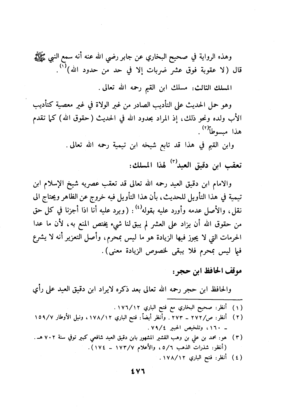 والإمام ابن دقيق العيد رحمه الله تعالى قد تعقب عصريه شيخ الإسلام ابن تيمية في هذا التأويل للحديث، بأن هذا التأويل فيه خروج عن الظاهر ويحتاج إلى نقل، والأصل عدمه وأورد عليه بقوله (4) : (ويرد عليه أنا إذا أجزنا في كل حق من حقوق الله أن يزاد على العشر لم يبق لنا شيء يختص المنع به، لأن ما عدا الحرمات التي لا يجوز فيها الزيادة هو ما ليس بمحرم، وأصل التعزير أنه لا يشرع فيما ليس بمحرم فلا يبقى لخصوص الزيادة معنى) .