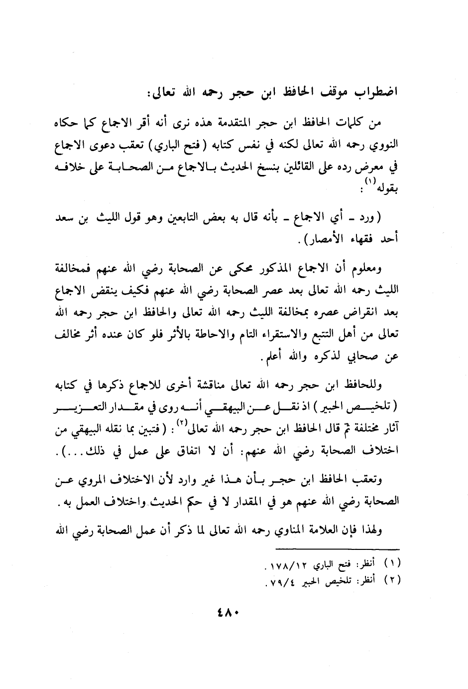 وللحافظ ابن حجر رحمه الله تعالى مناقشة أخرى للإجماع ذكرها في كتابه (تلخيص الحبير) إذ نقل عن البيهقي أنه روى في مقدار التعزير آثار مختلفة ثم قال الحافظ ابن حجر رحمه الله تعالى (3) : (فتبين بما نقله البيهقي من اختلاف الصحابة رضي الله عنهم: أن لا اتفاق على عمل في ذلك ... ) . وتعقب الحافظ ابن حجر بأن هذا غير وارد لأن الاختلاف المروي عن الصحابة رضي الله عنهم هو في المقدار لا في حكم الحديث واختلاف العمل به. ولهذا فإن العلامة المناوي رحمه الله تعالى لما ذكر أن عمل الصحابة رضي الله