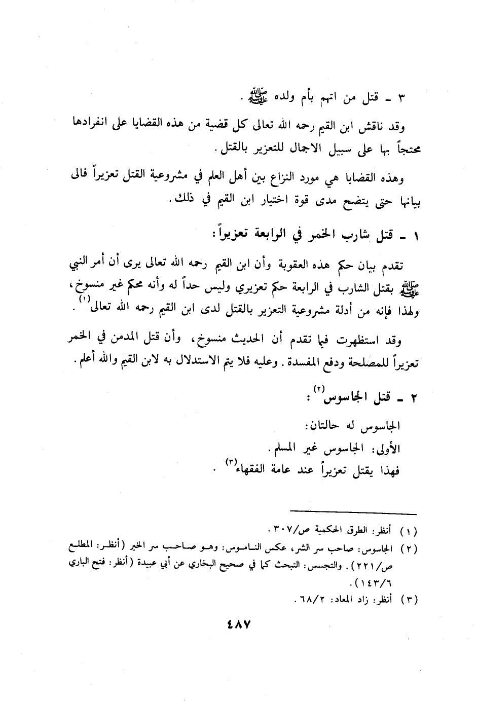 وقد ناقش ابن القيم رحمه الله تعالى كل قضية من هذه القضايا على انفرادها محتجاً بها على سبيل الإجمال للتعزير بالقتل!