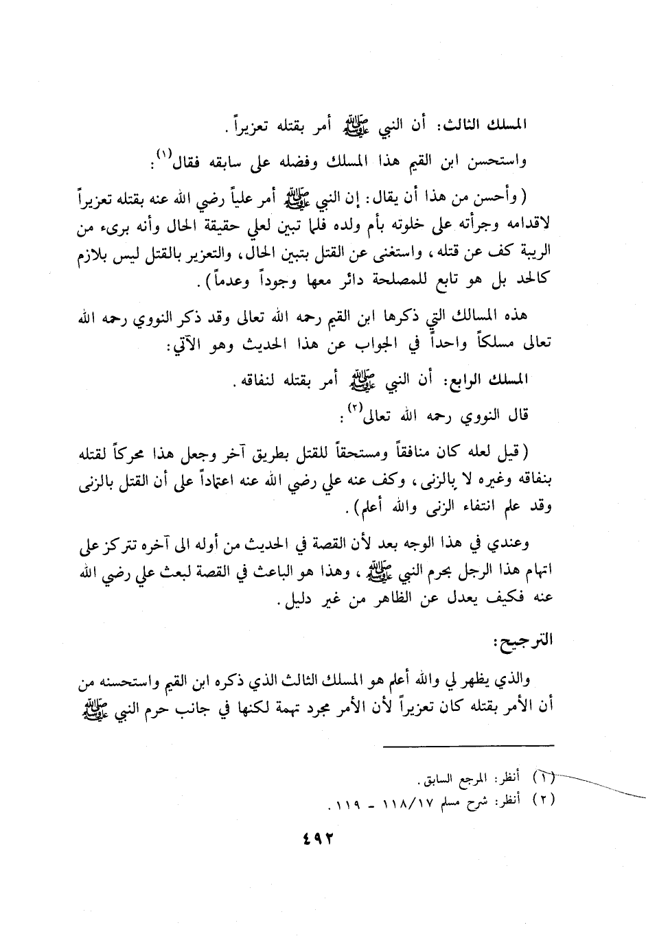 والذي يظهر لي والله أعلم هو المسلك الثالث الذي ذكره ابن القيم واستحسنه من أن الأمر بقتله كان تعزيراً لأن الأمر مجرد تهمة لكنها في جانب حرم النبي صلى الله عليه وسلم