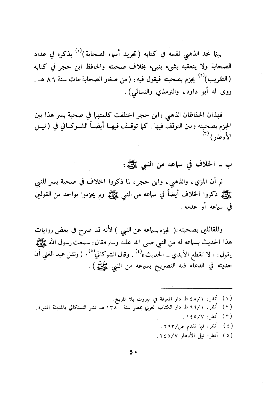 وللقائلين بصحبته: (الجزم بسماعه عن النبي) لأنه قد صرح في بعض روايات هذا الحديث بسماعه له من النبي صلى الله عليه وسلم فقال: سمعت رسول الله صلى الله عليه وسلم يقول: " لا تقطع الأيدي- الحديث (4) . وقال الشوكاني (5) : (ونقل عبد الغني أن حديثه في الدعاء فيه التصريح بسماعه من النبي صلى الله عليه وسلم) .