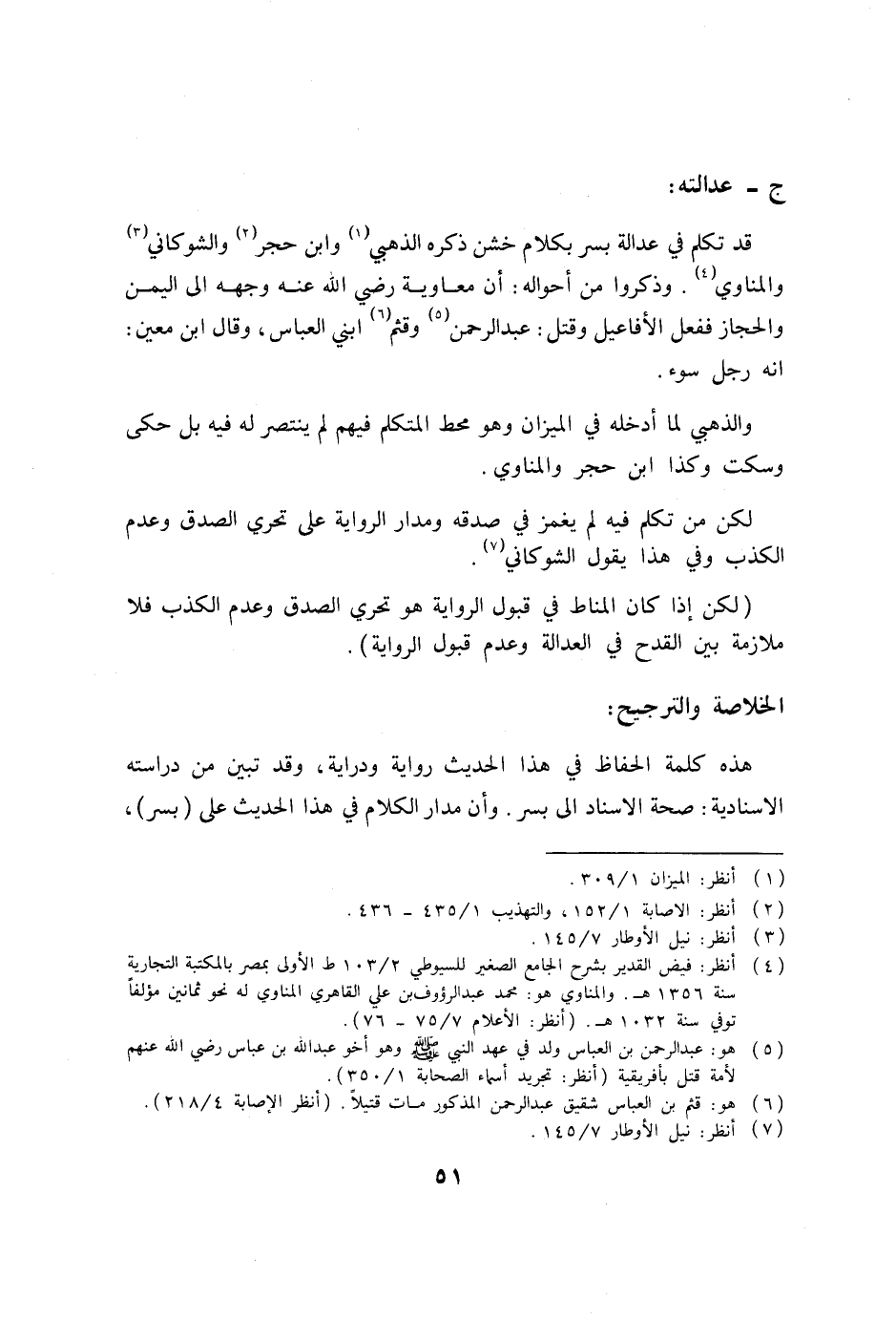 قد تكلم في عدالة بسر بكلام خشن ذكره الذهبي (1) وابن حجر (2) والشوكاني (3) والمناوي (4) . وذكروا من أحواله: أن معاوية رضي الله عنه وجهه إلى اليمن والحجاز ففعل الأفاعيل وقتل: عبد الرحمن (5) وقثم (6) ابني العباس، وقال ابن معين: أنه رجل سوء.