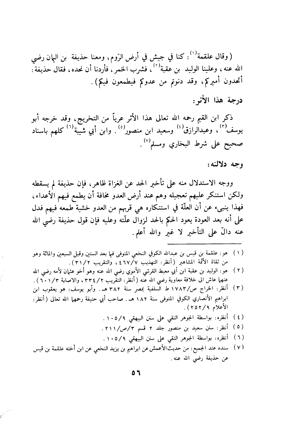 ووجه الاستدلال منه على تأخير الحد عن الغزاة ظاهر، فإن حذيفة لم يسقطه ولكن استنكر عليهم تعجيله وهم عند أرض العدو مخافة أن يطمع فيهم الأعداء، فهذا ينبئ عن أن العلة في استنكاره هي قربهم من العدو خشية طمعه فيهم فدل على أنه بعد العودة يعود الحكم بالحد لزوال علته وعليه فإن قول حذيفة رضي الله عنه دالّ على التأخير لا غير والله أعلم.