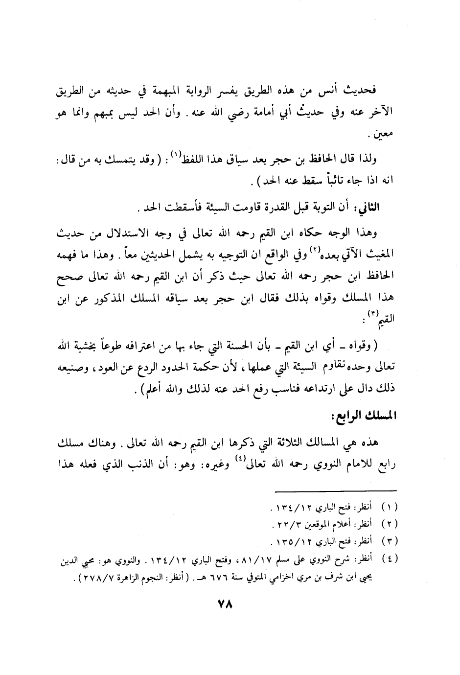 هذه هي المسالك الثلاثة التي ذكرها ابن القيم رحمه الله تعالى. وهناك مسلك رابع للإمام النووي رحمه الله تعالى (4) وغيره: وهو: أن الذنب الذي فعله هذا
