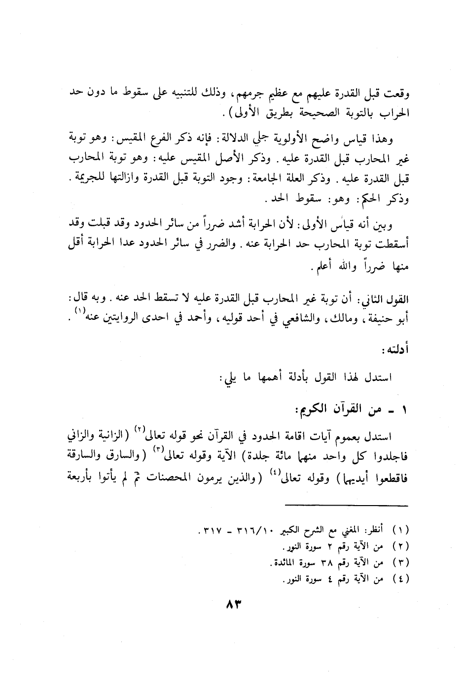 وهذا قياس واضح الأولوية جلي الدلالة: فإنه ذكر الفرع المقيس: وهو توبة غير المحارب قبل القدرة عليه. وذكر الأصل المقيس عليه: وهو توبة المحارب قبل القدرة عليه. وذكر العلة الجامعة: وجود التوبة قبل القدرة وإزالتها للجريمة. وذكر الحكم: وهو: سقوط الحد.
