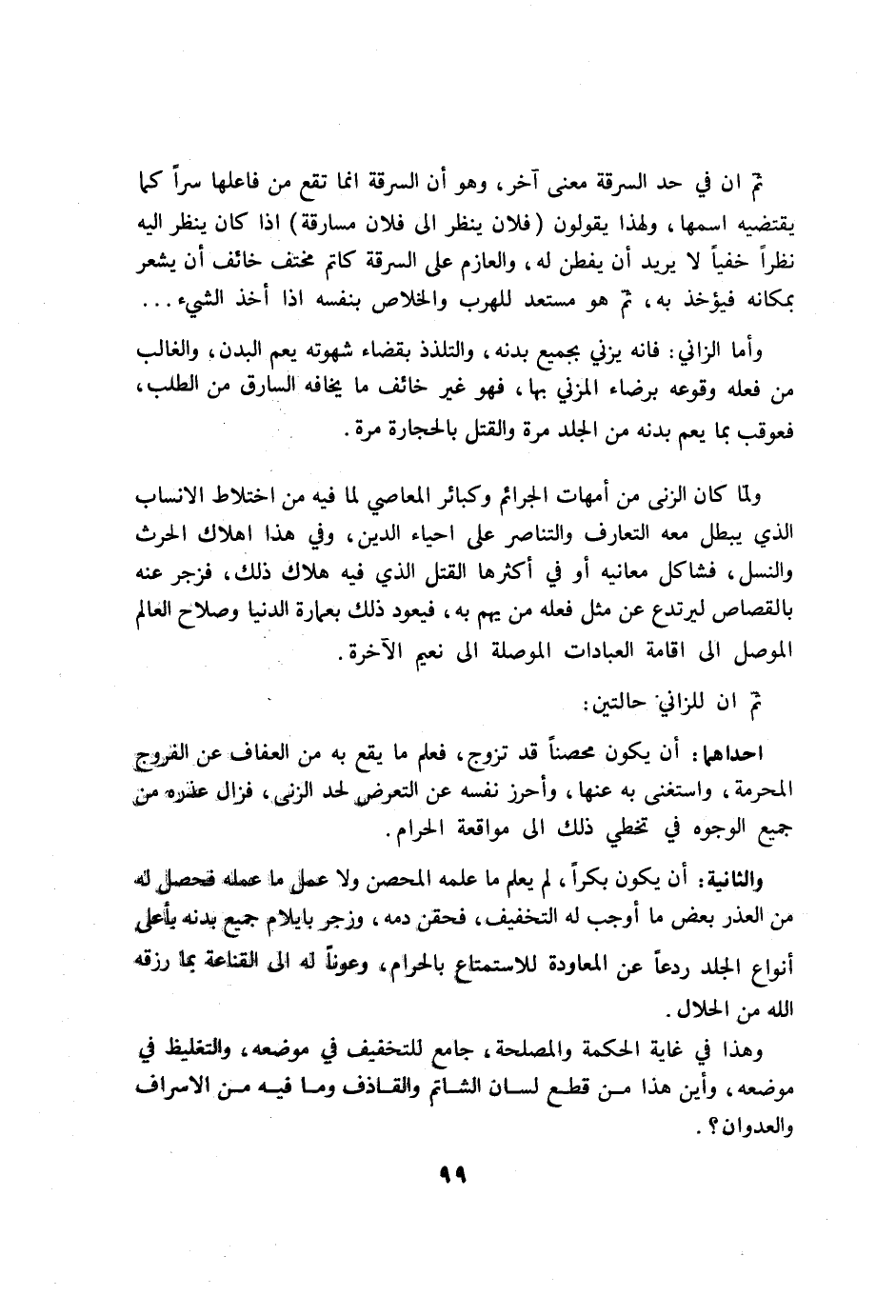 ثم إن في حد السرقة معنى آخر، وهو أن السرقة إنما تقع من فاعلها سراً كما يقتضيه اسمها، ولهذا يقولون (فلان ينظر إلى فلان مسارقة) إذا كان ينظر إليه نظراً خفياً لا يريد أن يفطن له، والعازم على السرقة كاتم مختف خائف أن يشعر بمكانه فيؤخذ به، ثم هو مستعد للهرب والخلاص بنفسه إذا أخذ الشيء ... وأما الزاني: فإنه يزني بجميع بدنه، والتلذذ بقضاء شهوته يعم البدن، والغالب
