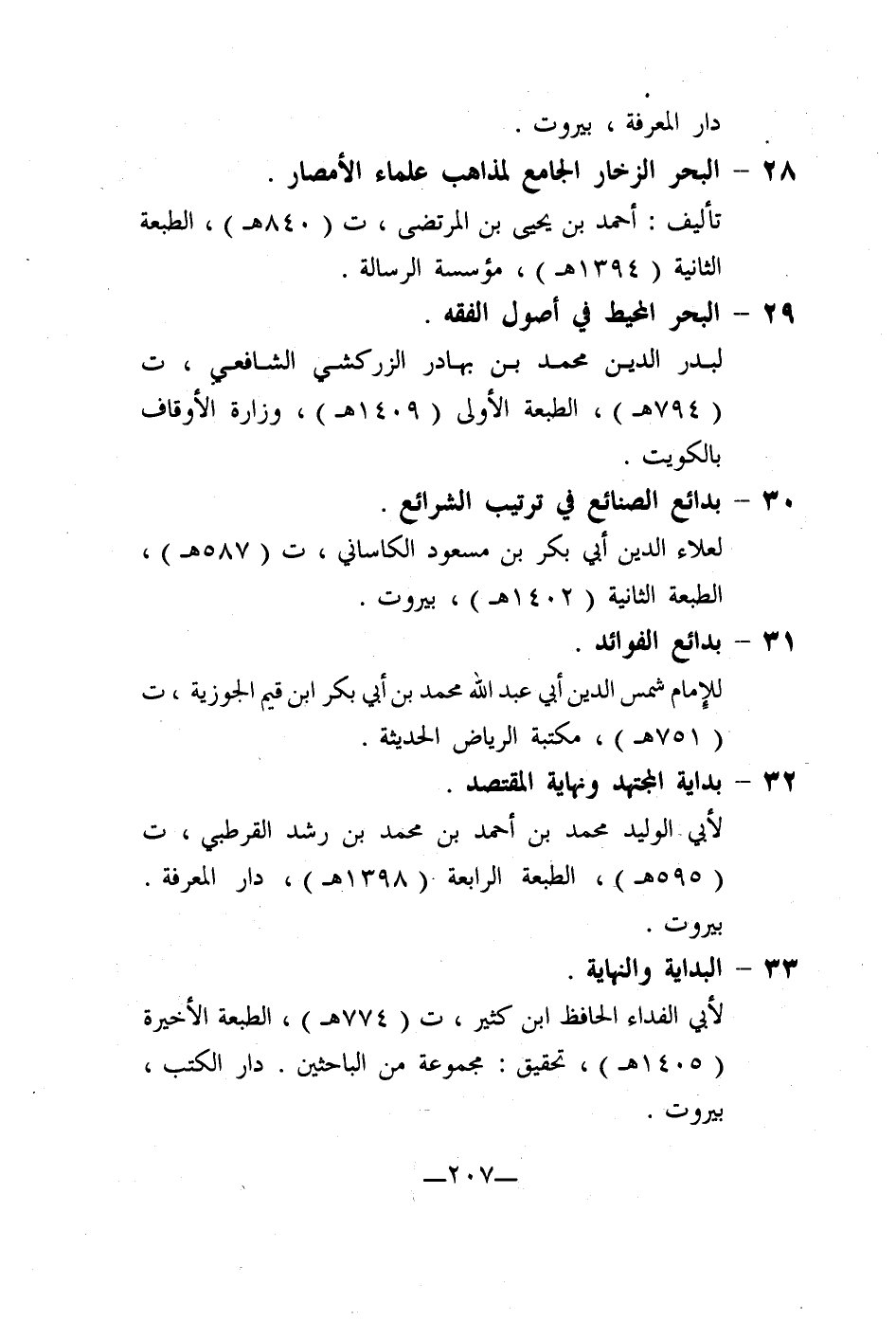 32- بداية المجتهد ونهاية المقتصد: لأبي الوليد محمد بن أحمد بن محمد بن رشد القرطبي، ت (595 هـ) ، الطبعة الرابعة (1398هـ) ، دار المعرفة. بيروت.