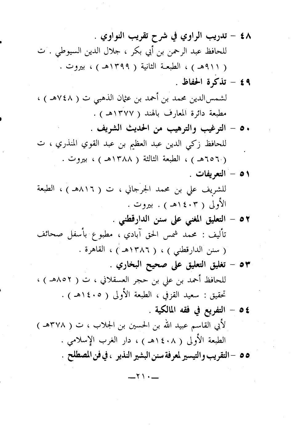 48- تدريب الراوي في شرح تقريب، النواوي: للحافظ عبد الرحمن بن أبي بكر، جلال الدين السيوطى. ت (911 هـ) ، الطبعة التانية (1399هـ) ، بيروت.