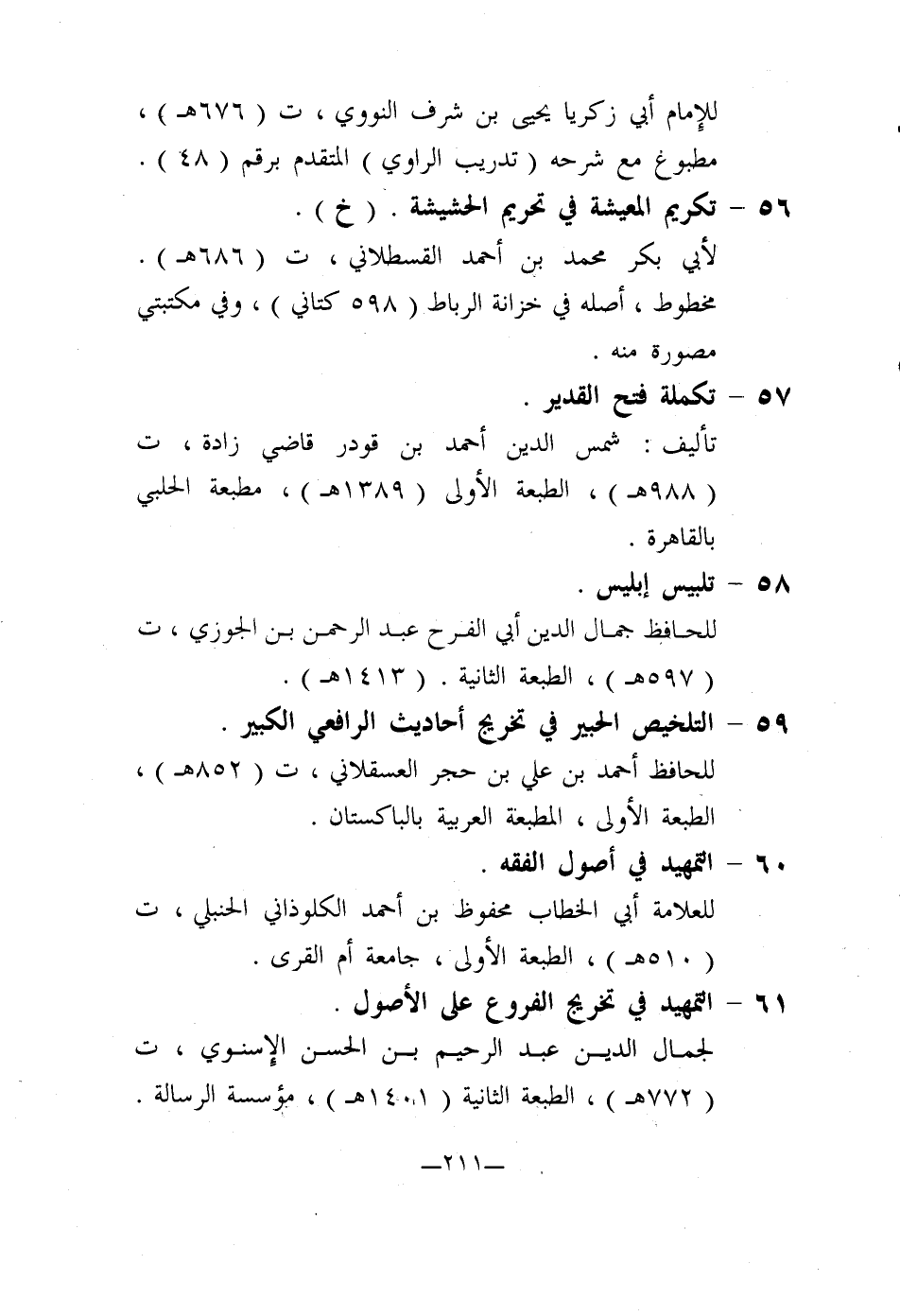59- التلخيص الحبير في تخرج أحاديث الرافعي الكبير: للحافظ أحمد بن علي بن حجر العسقلاني، ت (852 هـ) ، الطبعة الأولى، المطبعة العربية بالباكستان.