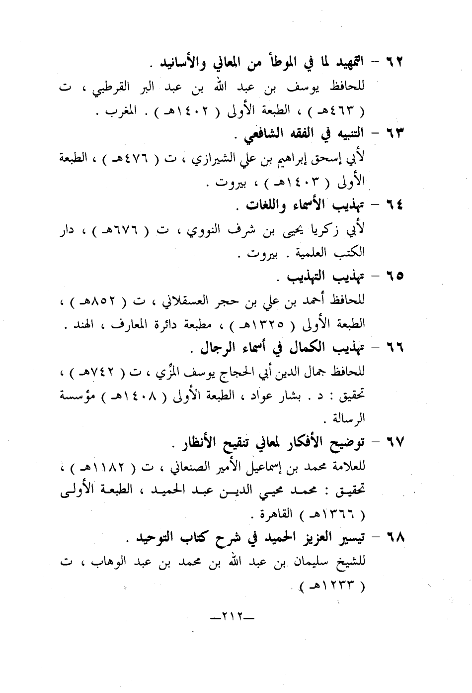 63- التنبيه في الفقه الشافعي: لأبى إسحق إبراهيم بن علي الشيرازي، ت (476 هـ) ، الطبعة الأولى (1453 هـ) ، بيروت.
