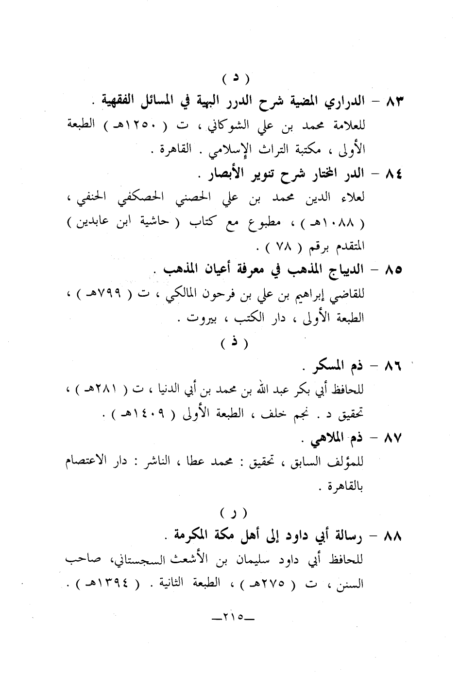 88- رسالة أبي داود إلى أهل مكة المكرمة: للحافظ أبي داود سليمان بن الأشعث السجستاني، صاحب السنن، ت (275 هـ) ، الطبعة الثانية. (1394هـ) .