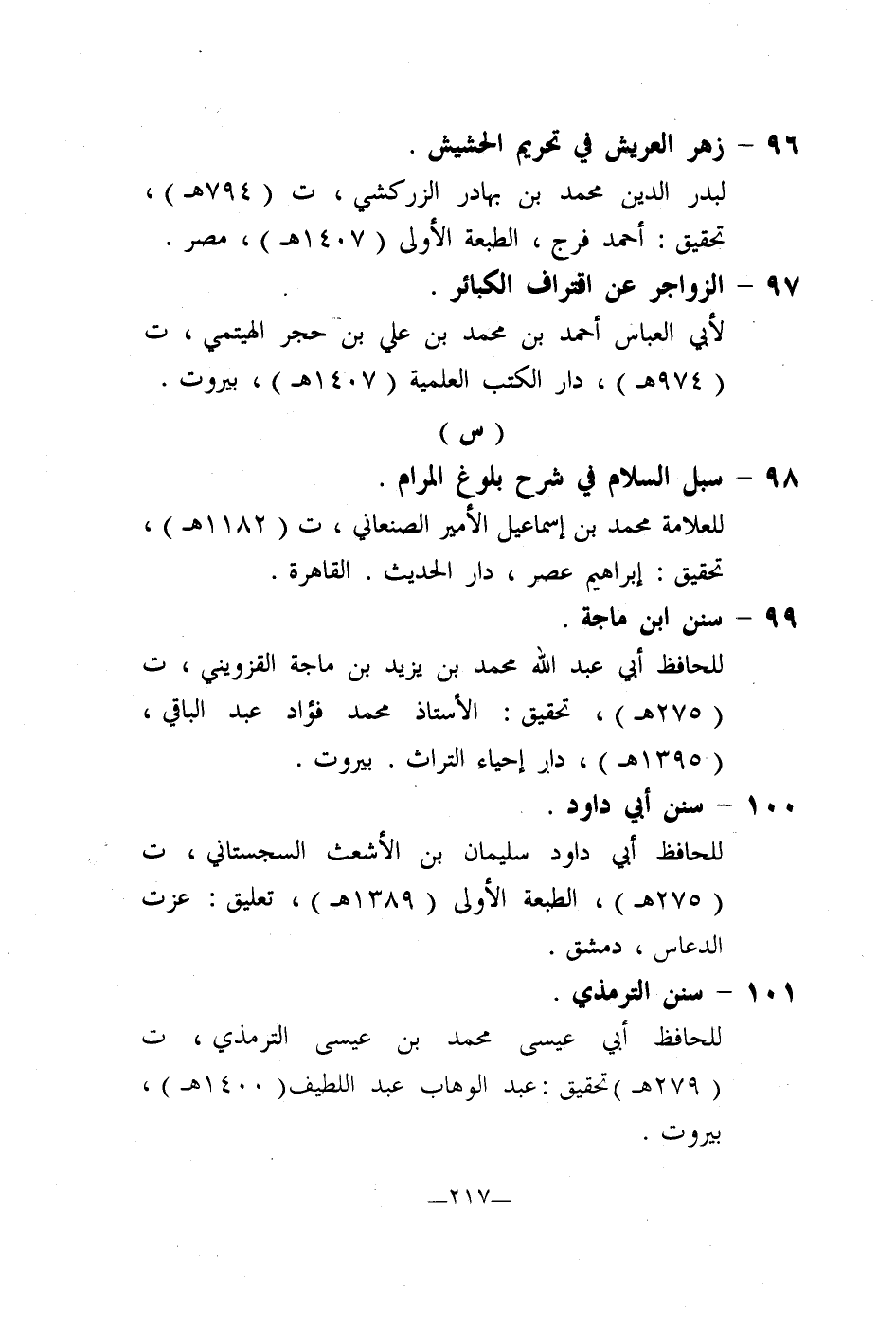100- سنن أبي داود: للحافظ أبي داود سليمان بن الأشعث السجستاني، ت (275 هـ) ، الطبعة الأولى (1389هـ) ، تعليق: عزت الدعاس، دمشق.