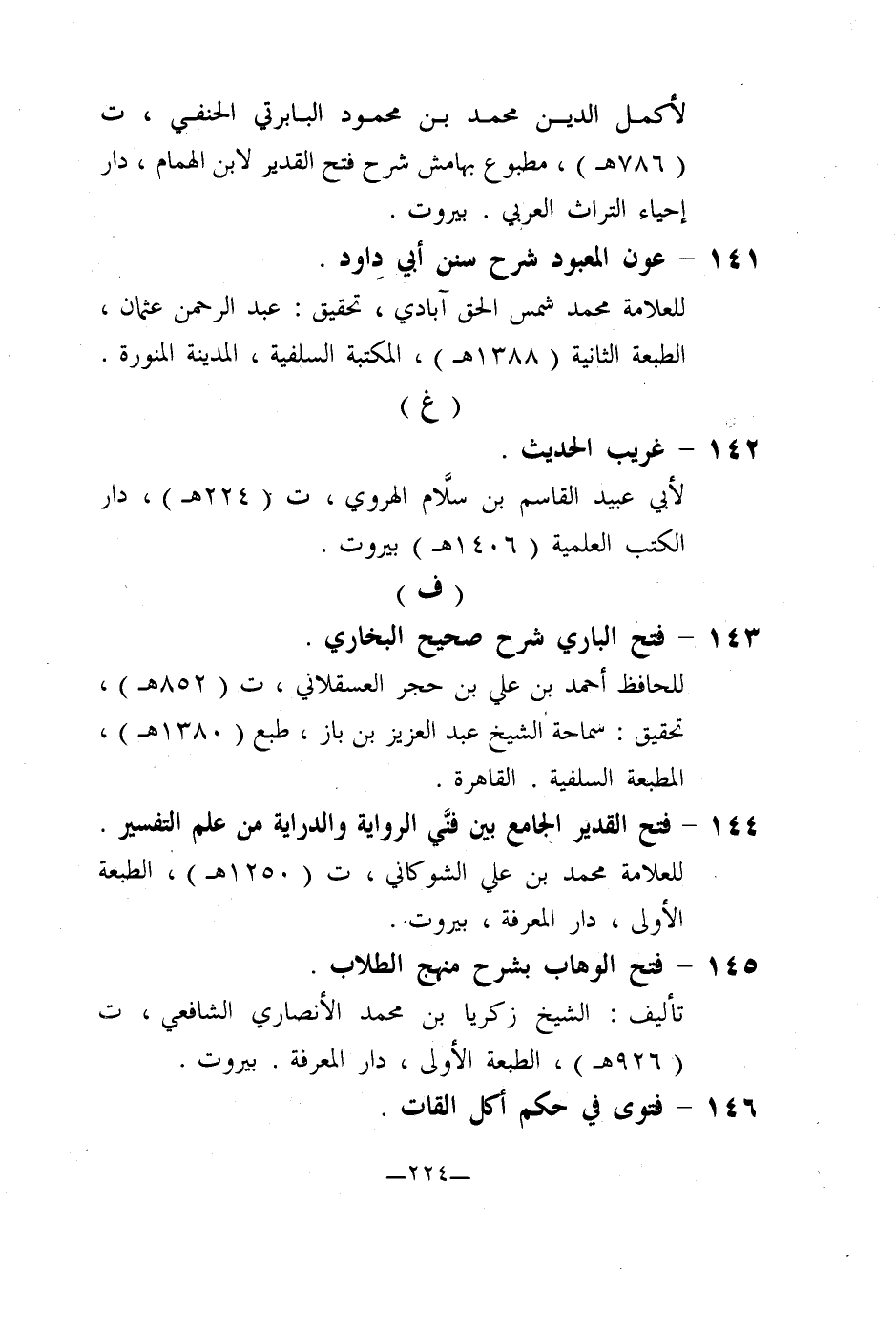 143- فتح الباري شرح صحيح البخاري: للحافظ أحمد بن علي بن حجر العسقلاني، ت (852 هـ) ، تحقيق: سماحة الشيخ عبد العزيز بن باز، طبع (1385هـ) ، المطبعة السلفية. القاهرة.
