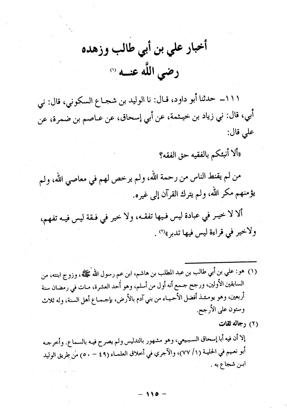 104 - حَدَّثَنَا أَبُو دَاوُدَ قَالَ: نا الْوَلِيدُ بْنُ شُجَاعٍ السَّكُونِيُّ، قَالَ: ني أَبِي قَالَ: ني زِيَادُ بْنُ خَيْثَمَةَ، عَنْ أَبِي إِسْحَاقَ، عَنْ عَاصِمِ بْنِ ضَمْرَةَ، عَنْ عَلِيٍّ، قَالَ: §أَلَا أُنَبِّئُكُمْ بِالْفَقِيهِ حَقِّ الْفِقْهِ؟ مَنْ لَمْ يُقَنِّطِ النَّاسَ مِنْ رَحْمَةِ اللَّهِ، وَلَمْ يُرَخِّصْ لَهُمْ فِي مَعَاصِي اللَّهِ، وَلَمْ يُؤَمِّنْهُمْ مَكَرَ اللَّهِ، وَلَمْ يَتْرُكِ الْقُرْآنَ إِلَى غَيْرِهِ. أَلَا لَا خَيْرَ فِي عِبَادَةٍ لَيْسَ فِيهَا تَفَقُّهٌ، وَلَا خَيْرَ فِي فِقْهٍ لَيْسَ فِيهِ تَفَهُّمٌ، وَلَا خَيْرَ فِي قِرَاءَةٍ لَيْسَ فِيهَا تَدَبُّرٌ.