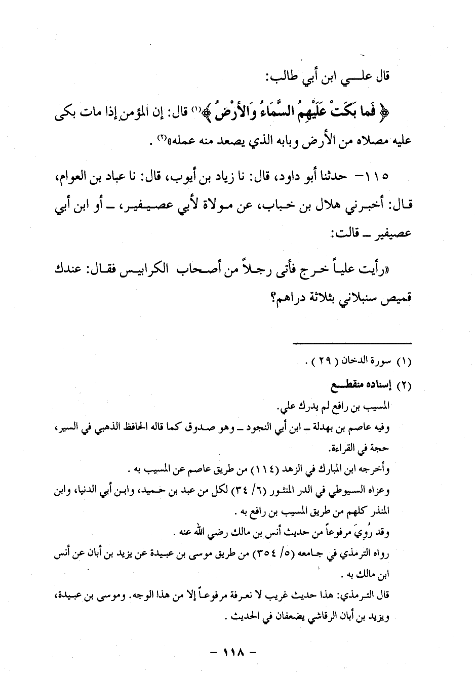 108 - حَدَّثَنَا أَبُو دَاوُدَ قَالَ: نا زِيَادُ بْنُ أَيُّوبَ، قَالَ: نا عَبَّادُ بْنُ الْعَوَّامِ، قَالَ: أَخْبَرَنِي هِلَالُ بْنُ خَبَّابٍ، عَنْ مَوْلَاةٍ لِأَبِي عُصَيْفِيرٍ أَوِ ابْنِ أَبِي عُصَيْفِيرٍ قَالَتْ: §رَأَيْتُ عَلِيًّا خَرَجَ فَأَتَى رَجُلًا مِنْ أَصْحَابِ الْكَرَابِيسِ فَقَالَ: عِنْدَكَ قَمِيصٌ سُنْبُلَانِيُّ بِثَلَاثَةِ دَرَاهِمَ؟ -[119]- فَأَخْرَجَ إِلَيْهِ قَمِيصًا، فَإِذَا هُوَ إِلَى أَنْصَافِ سَاقَيْهِ، فَنَظَرَ عَنْ يَمِينِهِ وَعَنْ شِمَالِهِ فَقَالَ: مَا أَرَى هَذَا عَلَيَّ إِلَّا قَدْرًا حَسَنًا، بِكَمْ هُوَ؟ قَالَ: بِأَرْبَعَةِ دَرَاهِمَ يَا أَمِيرَ الْمُؤْمِنِينَ. . . . فَدَفَعَهَا إِلَيْهِ ثُمَّ انْطَلَقَ.