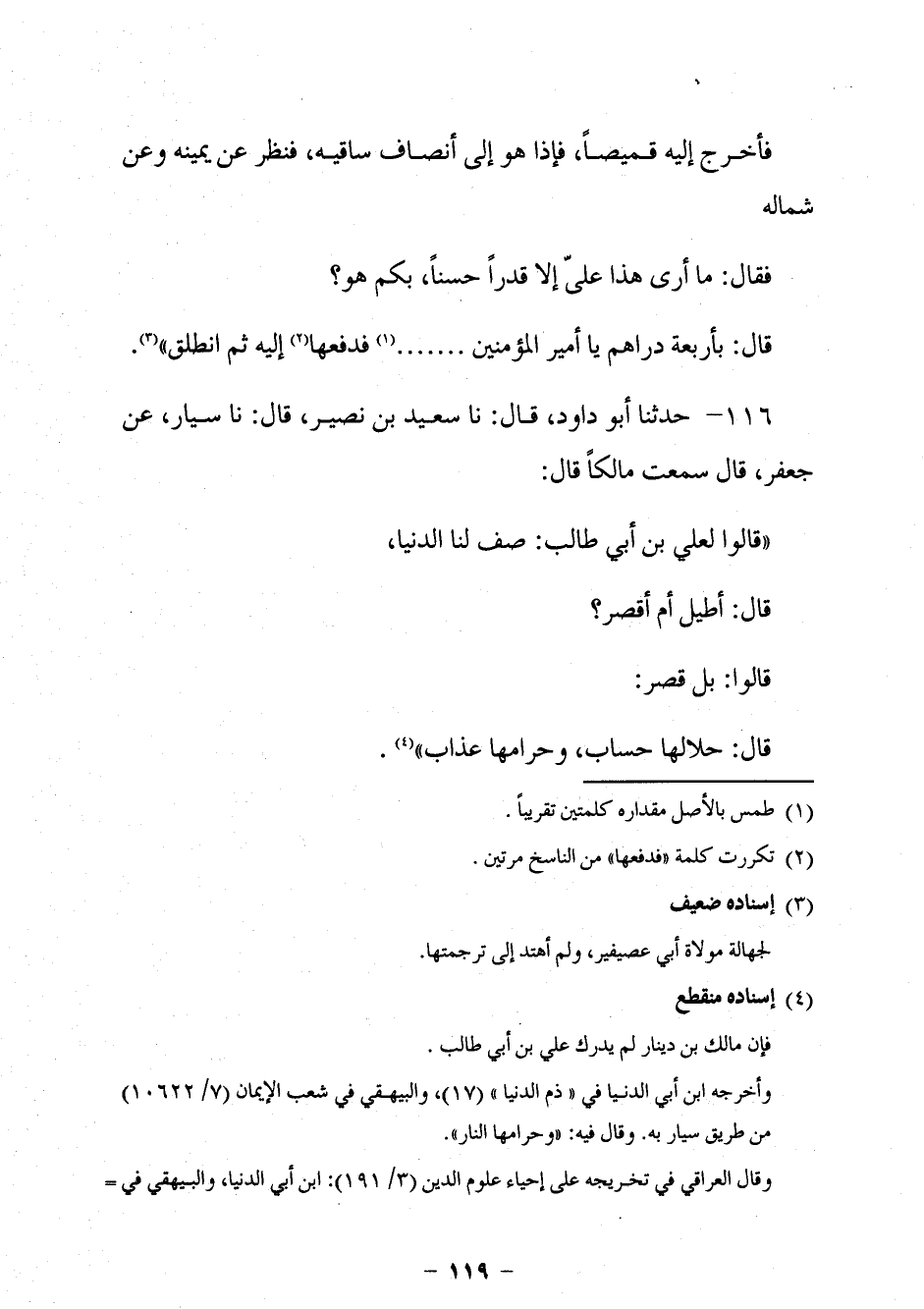 109 - حَدَّثَنَا أَبُو دَاوُدَ قَالَ: نا سَعِيدُ بْنُ نُصَيْرٍ، قَالَ: نا سَيَّارٌ، عَنْ جَعْفَرٍ، قَالَ: سَمِعْتُ مَالِكًا، قَالَ: §قَالُوا لِعَلِيِّ بْنِ أَبِي طَالِبٍ: صِفْ لَنَا الدُّنْيَا، قَالَ: أُطِيلُ أَمْ أُقْصِرْ؟ قَالُوا بَلْ قَصِّرْ: قَالَ: حَلَالُهَا حِسَابٌ، وَحَرَامُهَا عَذَابٌ