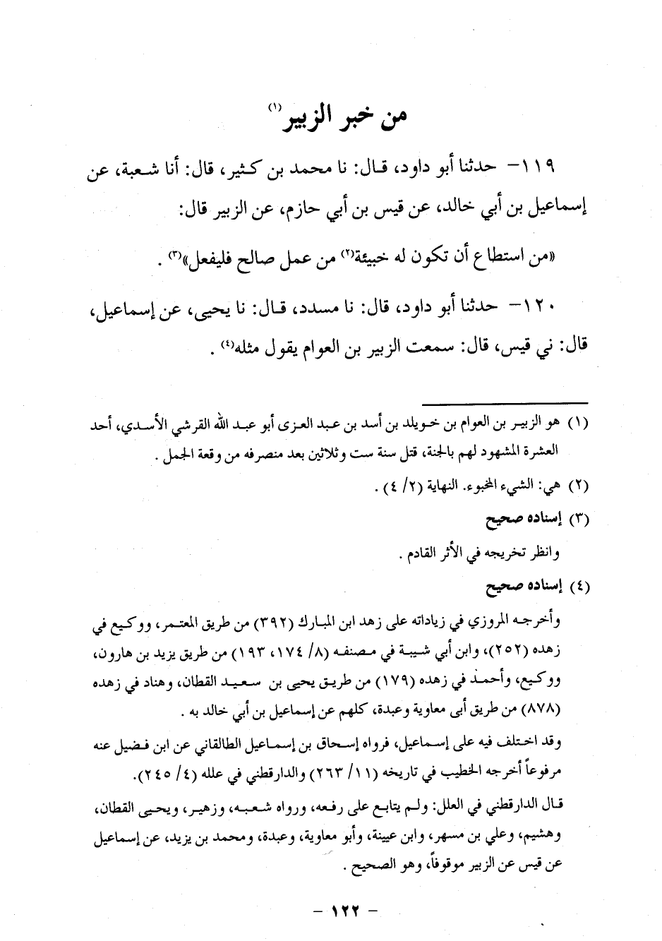 112 - حَدَّثَنَا أَبُو دَاوُدَ قَالَ: نا مُحَمَّدُ بْنُ كَثِيرٍ، قَالَ: أنا شُعْبَةُ، عَنْ إِسْمَاعِيلَ بْنِ أَبِي خَالِدٍ، عَنْ قَيْسِ بْنِ أَبِي حَازِمٍ، عَنِ الزُّبَيْرِ قَالَ: §مَنِ اسْتَطَاعَ أَنْ تَكُونَ لَهُ خَبيئَةُ مِنْ عَمَلٍ صَالِحٍ فَلْيَفْعَلْ. حَدَّثَنَا أَبُو دَاوُدَ قَالَ: نا مُسَدَّدٌ، قَالَ: نا يَحْيَى، عَنْ إِسْمَاعِيلَ، قَالَ: ني قَيْسٌ، قَالَ: سَمِعْتُ الزُّبَيْرَ بْنَ الْعَوَّامِ، يَقُولُ مِثْلَهُ.
