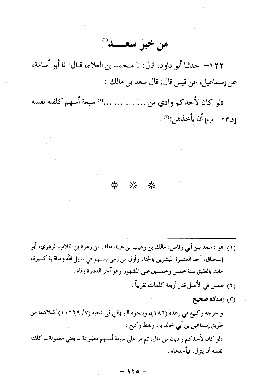 114 - حَدَّثَنَا أَبُو دَاوُدَ قَالَ: نا مُحَمَّدُ بْنُ الْعَلَاءِ، قَالَ: نا أَبُو أُسَامَةَ، عَنْ إِسْمَاعِيلَ، عَنْ قَيْسٍ، قَالَ: قَالَ سَعْدُ بْنُ مَالِكٍ: §لَوْ كَانَ لِأَحَدِكُمْ وَادٍ مِنْ. . . . . . . . سَبْعَةَ أَسْهُمٍ كَلَّفَتْهُ نَفْسُهُ أَنْ يَأْخُذَهُنَّ.