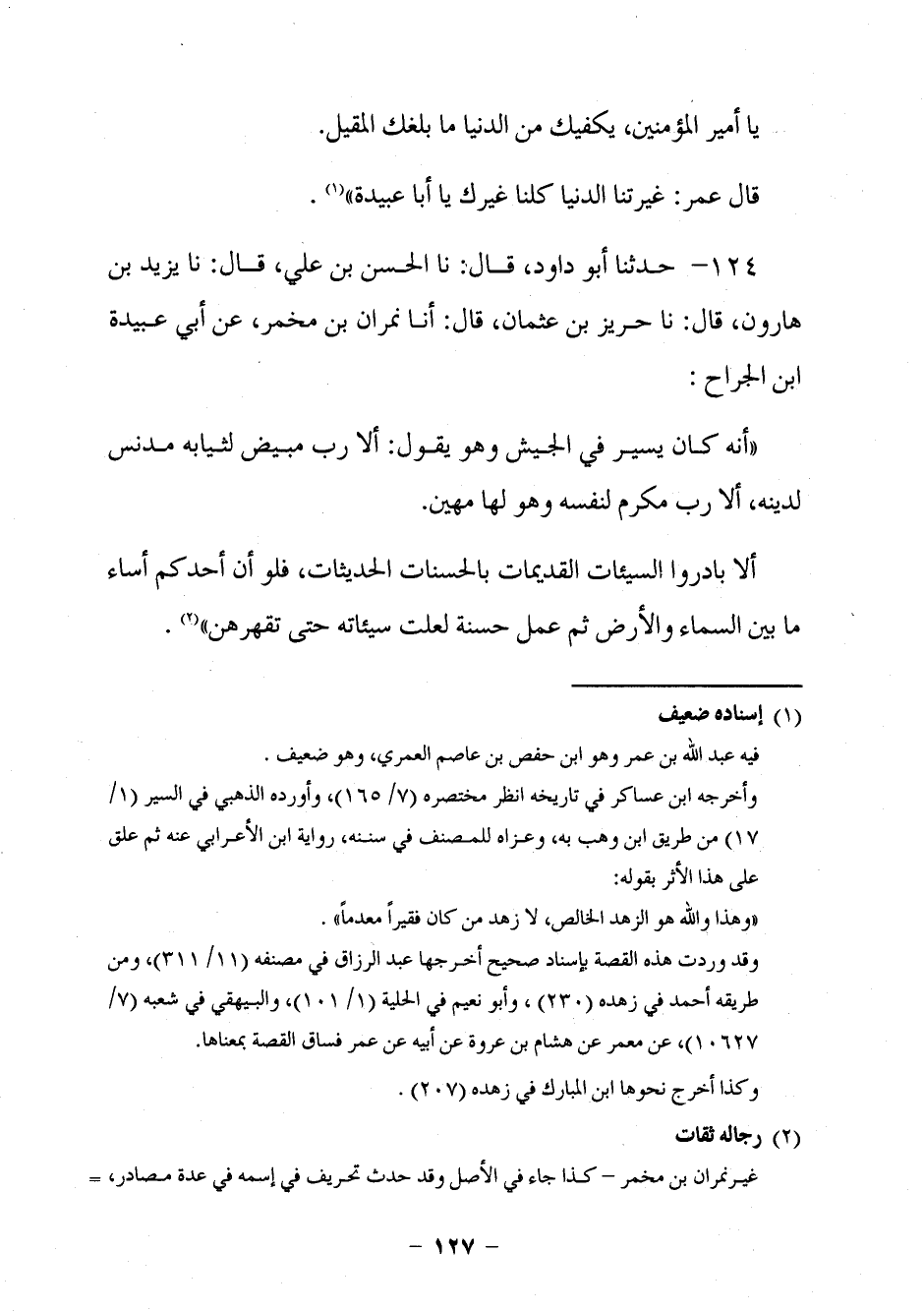 116 - حَدَّثَنَا أَبُو دَاوُدَ قَالَ: نا الْحَسَنُ بْنُ عَلِيٍّ، قَالَ: نا يَزِيدُ بْنُ هَارُونَ، قَالَ: نا حَرِيزُ بْنُ عُثْمَانَ، قَالَ: أنا نِمْرَانُ بْنُ مِخْمَرٍ، عَنْ أَبِي عُبَيْدَةَ بْنِ الْجَرَّاحِ: أَنَّهُ كَانَ يَسِيرُ فِي الْجَيْشِ وَهُوَ يَقُولُ: §أَلَا رُبَّ مُبَيِّضٍ لِثِيَابِهِ مُدَنِّسٍ لِدِينِهِ، أَلَا رُبَّ مُكْرِمٍ لِنَفْسِهِ وَهُوَ لَهَا مُهِينٌ , أَلَا بَادِرُوا السَّيِّئَاتِ الْقَدِيمَاتِ بِالْحَسَنَاتِ الْحَدِيثَاتِ، فَلَوْ أَنَّ أَحَدَكُمْ أَسَاءَ مَا بَيْنَ السَّمَاءِ وَالْأَرْضِ ثُمَّ عَمِلَ حَسَنَةً لَعَلَتْ سَيِّئَاتِهِ حَتَّى تَقْهَرَهُنَّ.
