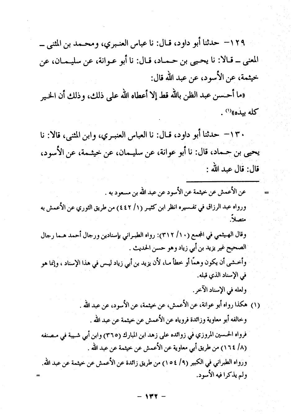 121 - حَدَّثَنَا أَبُو دَاوُدَ قَالَ: نا عَبَّاسٌ الْعَنْبَرِيُّ، وَمُحَمَّدُ بْنُ الْمُثَنَّى الْمَعْنَى قَالَا: نا يَحْيَى بْنُ حَمَّادٍ، قَالَ: نا أَبُو عَوَانَةَ، عَنْ سُلَيْمَانَ، عَنْ خَيْثَمَةَ، عَنِ الْأَسْوَدِ، عَنْ عَبْدِ اللَّهِ، قَالَ: §مَا أَحْسَنَ عَبْدٌ الظَّنَّ بِاللَّهِ قَطُّ إِلَّا أَعْطَاهُ اللَّهُ عَلَى ذَلِكَ، وَذَلِكَ أَنَّ الْخَيْرَ كُلَّهُ بِيَدِهِ.