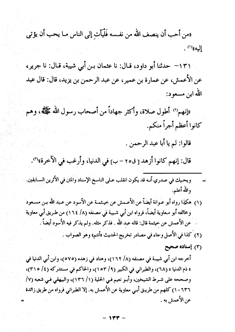 123 - حَدَّثَنَا أَبُو دَاوُدَ قَالَ: نا عُثْمَانُ بْنُ أَبِي شَيْبَةَ، قَالَ: نا جَرِيرٌ، عَنِ الْأَعْمَشِ، عَنْ عُمَارَةَ بْنِ عُمَيْرٍ، عَنْ عَبْدِ الرَّحْمَنِ بْنِ يَزِيدَ، قَالَ: قَالَ عَبْدُ اللَّهِ بْنُ مَسْعُودٍ: §أَنْتُمْ أَطْوَلُ صَلَاةً، وَأَكْثَرُ جِهَادًا مِنْ أَصْحَابِ رَسُولِ اللَّهِ صَلَّى اللَّهُ عَلَيْهِ وَسَلَّمَ، وَهُمْ كَانُوا أَعْظَمَ أَجْرًا مِنْكُمْ. قَالُوا: لِمَ يَا أَبَا عَبْدِ الرَّحْمَنِ؟ قَالَ: إِنَّهُمْ كَانُوا أَزْهَدَ فِي الدُّنْيَا، وَأَرْغَبَ فِي الْآخِرَةِ. -[134]- قَالَ أَبُو دَاوُدَ: كَذَا رَوَاهُ أَبُو مُعَاوِيَةَ، وَأَمَّا سُفْيَانُ فَقَالَ: عَنْ مَالِكِ بْنِ الْحَارِثِ عَنْ عَبْدِ الرَّحْمَنِ بِهِ.