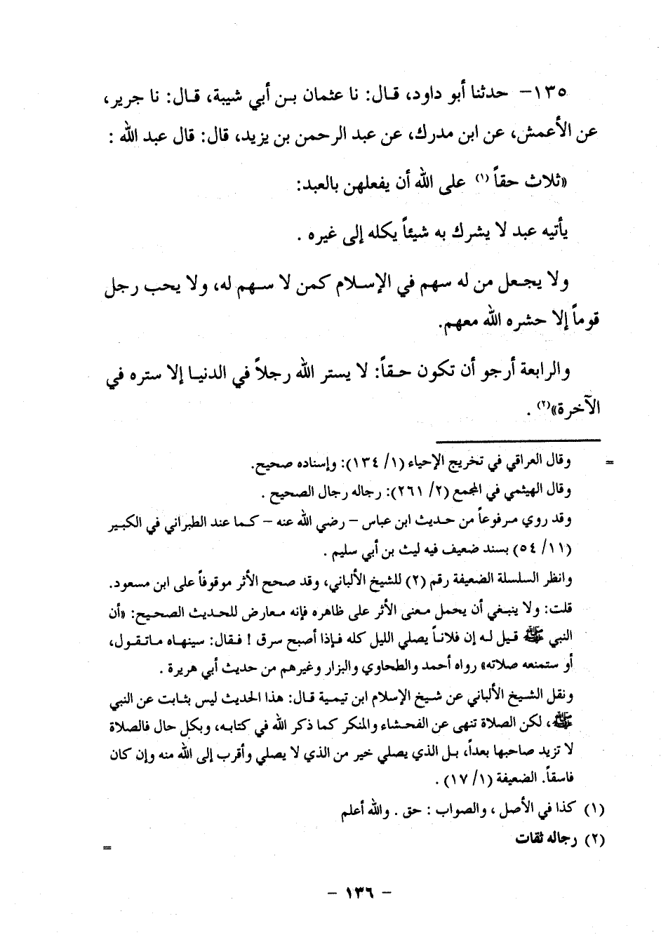 127 - حَدَّثَنَا أَبُو دَاوُدَ قَالَ: نا عُثْمَانُ بْنُ أَبِي شَيْبَةَ، قَالَ: نا جَرِيرٌ، عَنِ الْأَعْمَشِ، عَنِ ابْنِ مُدْرِكٍ، عَنْ عَبْدِ الرَّحْمَنِ بْنِ يَزِيدَ، قَالَ: قَالَ عَبْدُ اللَّهِ: §ثَلَاثٌ حَقًّا عَلَى اللَّهِ أَنْ يَفْعَلَهُنَّ بِالْعَبْدِ: يَأْتِيهِ عَبْدٌ لَا يُشْرِكُ بِهِ شَيْئًا يَكِلُهُ إِلَى غَيْرِهِ , وَلَا يَجْعَلُ مَنْ لَهُ سَهْمٌ فِي الْإِسْلَامِ كَمَنْ لَا سَهْمَ لَهُ، وَلَا يُحِبُّ رَجُلٌ قَوْمًا إِلَّا حَشَرَهُ اللَّهُ مَعَهُمْ. وَالرَّابِعَةُ أَرْجُو أَنْ تَكُونَ حَقًّا: لَا يَسْتُرُ اللَّهُ رَجُلًا فِي الدُّنْيَا إِلَّا سَتَرَهُ فِي الْآخِرَةِ.