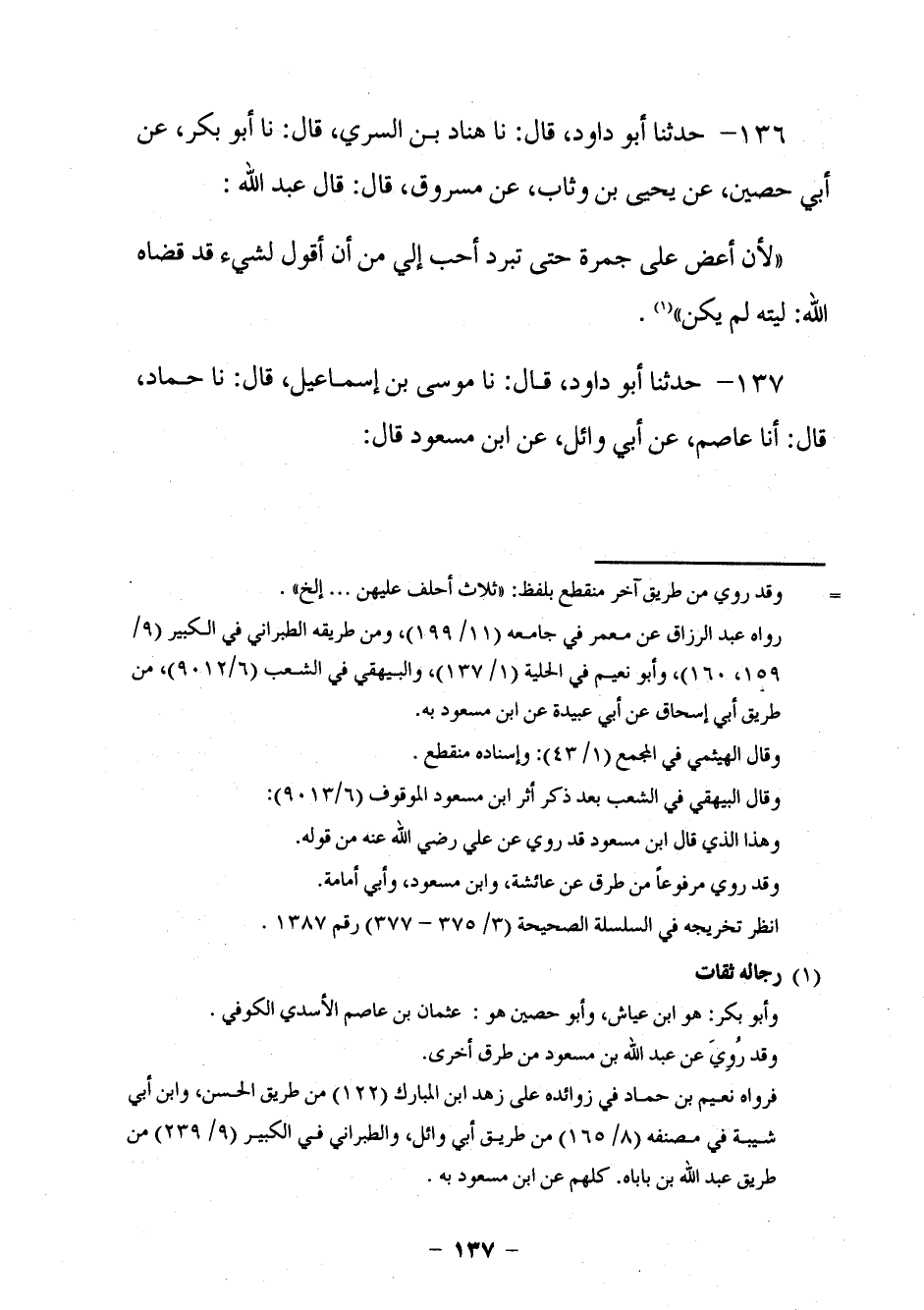 128 - حَدَّثَنَا أَبُو دَاوُدَ قَالَ: نا هَنَّادُ بْنُ السَّرِيِّ، قَالَ: نا أَبُو بَكْرٍ، عَنْ أَبِي حُصَيْنٍ، عَنْ يَحْيَى بْنِ وَثَّابٍ، عَنْ مَسْرُوقٍ، قَالَ: قَالَ عَبْدُ اللَّهِ: §لَأَنْ أَعُضَّ عَلَى جَمْرَةٍ حَتَّى تَبْرُدَ أَحَبُّ إِلَيَّ مِنْ أَنْ أَقُولَ لِشَيْءٍ قَدْ قَضَاهُ اللَّهُ: لَيْتَهُ لَمْ يَكُنْ.