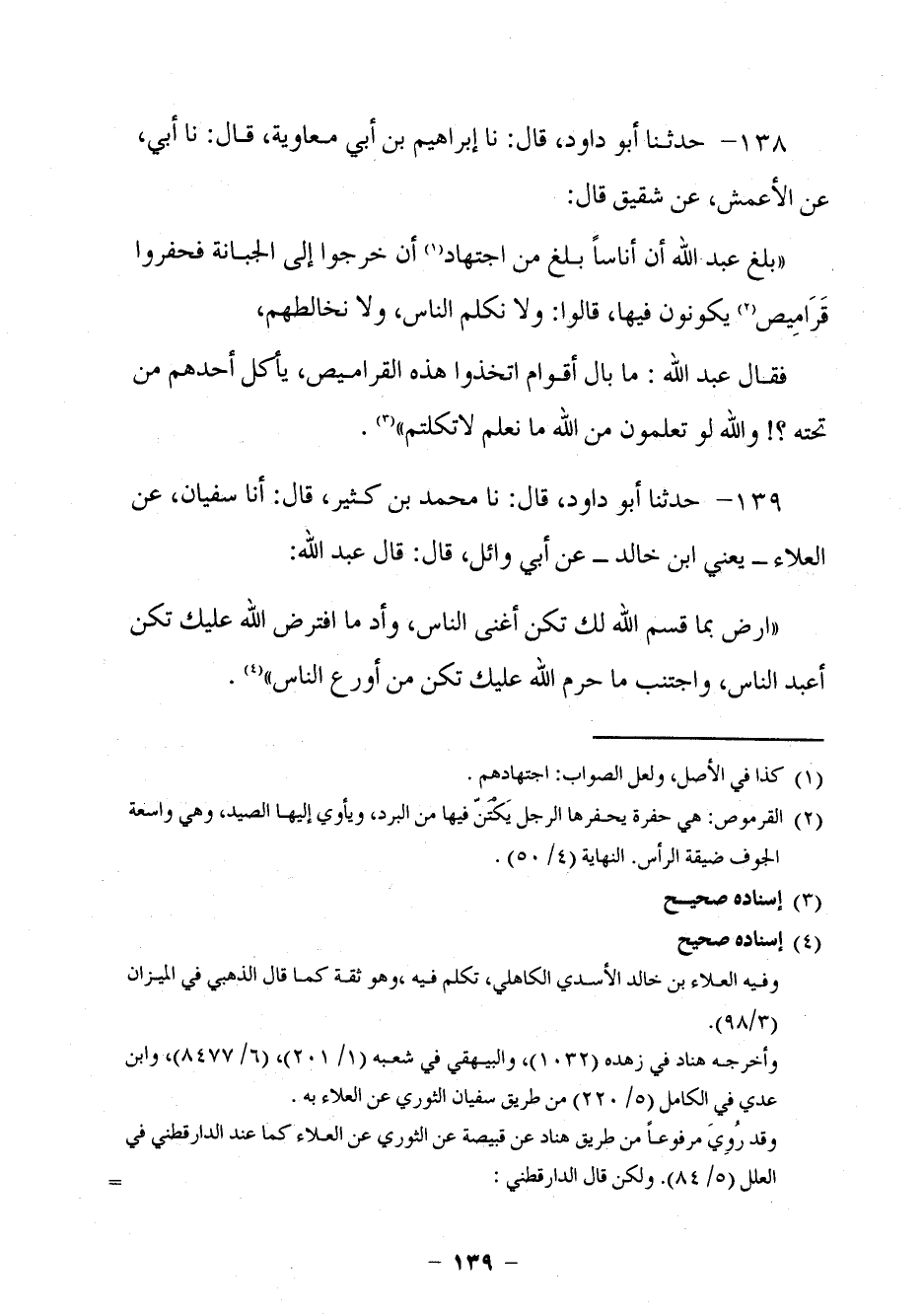131 - حَدَّثَنَا أَبُو دَاوُدَ قَالَ: نا مُحَمَّدُ بْنُ كَثِيرٍ، قَالَ: أنا سُفْيَانُ، عَنِ الْعَلَاءِ يَعْنِي ابْنَ خَالِدٍ، عَنْ أَبِي وَائِلٍ، قَالَ: قَالَ عَبْدُ اللَّهِ: " §ارْضَ بِمَا قَسَمَ اللَّهُ لَكَ تَكُنْ أَغْنَى النَّاسِ، وَأَدِّ مَا افْتَرَضَ اللَّهُ عَلَيْكَ تَكُنْ أَعْبُدَ النَّاسِ، وَاجْتَنِبْ مَا حَرَّمَ اللَّهُ عَلَيْكَ تَكُنْ مِنْ أَوْرَعِ النَّاسِ.