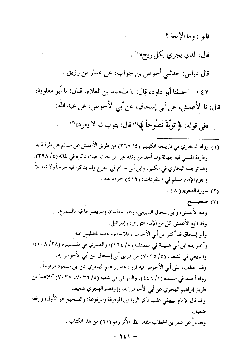 134 - حَدَّثَنَا أَبُو دَاوُدَ قَالَ: نا مُحَمَّدُ بْنُ الْعَلَاءِ، قَالَ: نا أَبُو مُعَاوِيَةَ، قَالَ: نا الْأَعْمَشُ، عَنْ أَبِي إِسْحَاقَ، عَنْ أَبِي الْأَحْوَصِ، عَنْ عَبْدِ اللَّهِ، فِي قَوْلِهِ: {تَوْبَةً نَصُوحًا} [التحريم: 8] قَالَ: §يَتُوبُ ثُمَّ لَا يَعُودُ.